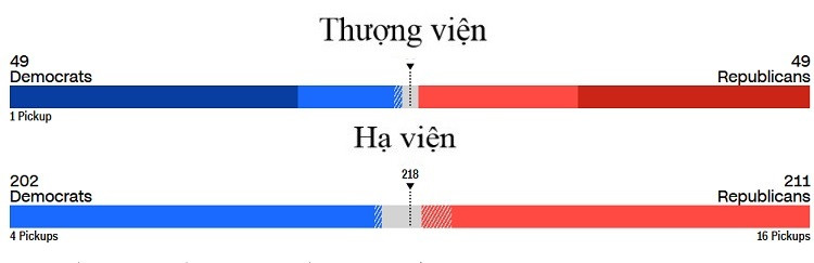 Tại Hạ viện, tính đến 22h30 giờ miền đông nước Mỹ ngày 11/11 (tức 10h30 giờ Việt Nam ngày 12/11), đảng Dân chủ có trong tay 202 ghế tại Hạ viện, kém đảng Cộng hòa 9 ghế.