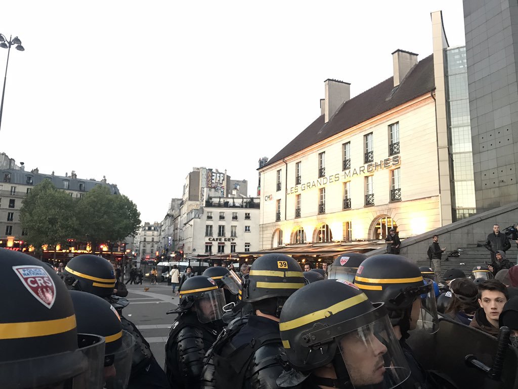 Trong một diễn biến liên quan, sau khi hay tin ứng viên cực hữu dẫn đầu, nhiều người đã biểu tình phản đối tại Trung tâm Paris. Cảnh sát chống bạo động đã phải sử dụng hơi cay tấn công vào đoàn biểu tình tập trung tại Place de la Bastille.