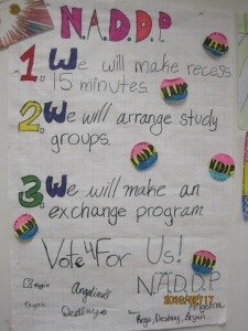 Đảng N.A.D.D.P. hứa 3 điều: 1) Chúng mình sẽ có thời gian giải lao 15 phút. 2) Chúng mình sẽ tổ chức các nhóm học tập. 3) Chúng mình sẽ thực hiện một chương trình giao lưu.