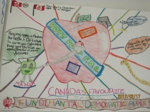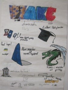 Mỗi lần như vậy, không thể bỏ qua cái thú coi “tác phẩm” của học sinh trưng bày dọc hành lang. Lần này, lớp của con trai triển lãm hình ảnh chiến dịch tranh cử mô phỏng theo bầu cử liên bang, một phần trong môn xã hội học.