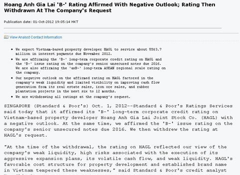 (VEF.VN) - Thông tin từ Standard & Poor's (S&P) ngày 1/10 cho biết, Công ty Cổ phần Hoàng Anh Gia Lai (HAG) của bầu Đức yêu cầu tổ chức này rút lại tất cả các mức xếp hạng đối với HAG. Như vậy, rất có thể đây là lần cuối S&P xếp hạng HAG.
