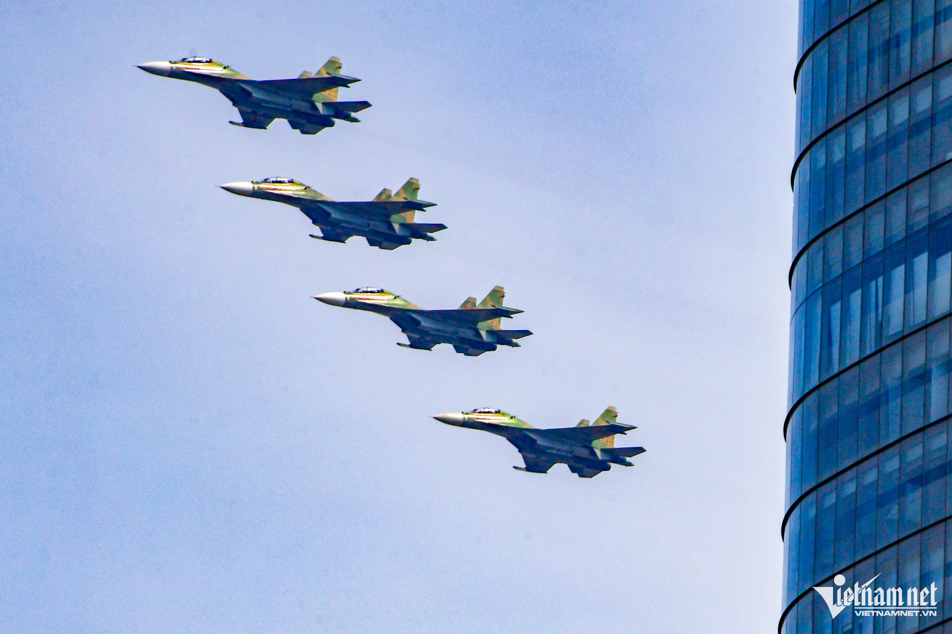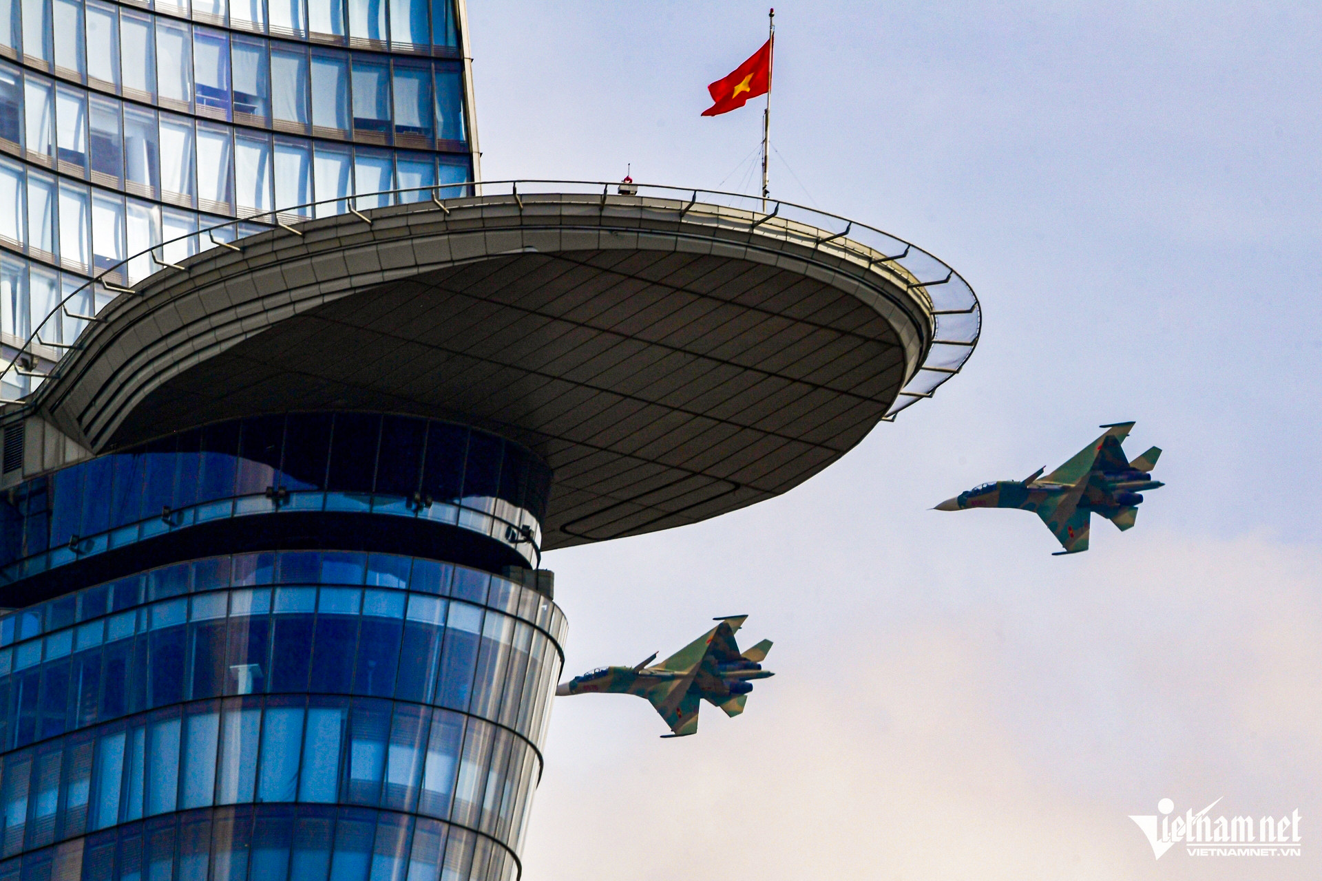Ngay sau đó, dàn chiến đấu cơ Su-30MK2 và Yak-130 cũng đồng loạt xuất kích, thực hiện nhiều động tác kỹ thuật phức tạp, đẹp mắt. Trong ảnh là biên đội "hổ mang chúa" bay qua tòa Bitexco - một biểu tượng tiêu biểu của TPHCM với hình dáng của búp sen thanh khiết tỏa sáng dưới ánh nắng tựa như một Việt Nam đang nở rộ rực rỡ.