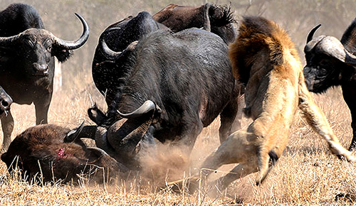 Con trâu đầu đàn bất chấp nguy hiểm lao về phía đàn sư tử để giải cứu một con trâu đã ngã gục. Nó tung ra cú húc sấm sét buộc sư tử phải tháo chạy.