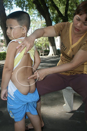 cháu đến chỉ cho chúng tôi xem những vết bầm còn hiện trên thân thể bé, mặc dù