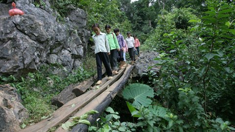 Nhiều đoạn men bên bờ vực rất hẹp chỉ đủ đặt một tấm ván gỗ rộng chừng 20 cm nối sang phía bên kia. Mỗi lần đi qua đoạn này bé Sinh vẫn phải bám vào đá lấy thăng bằng tránh rơi xuống vực.