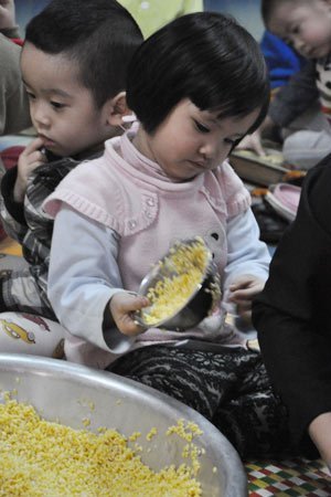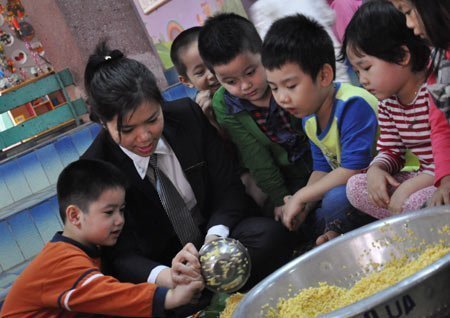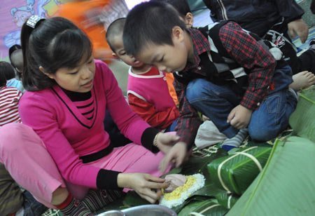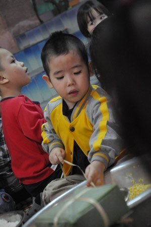 | Trẻ làm quen với việc gói bánh chưng... |