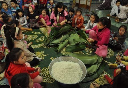 "Bánh chưng vuông là biểu tượng cho mặt đất các con nhé!" |