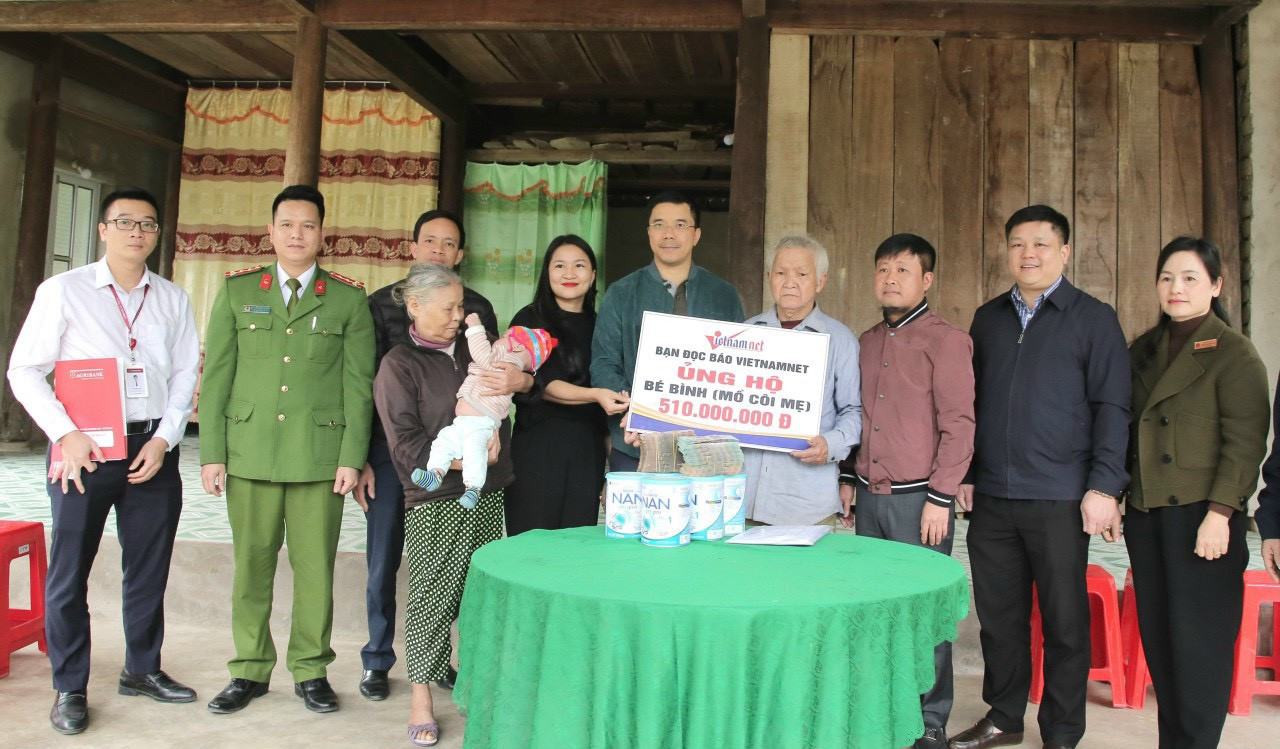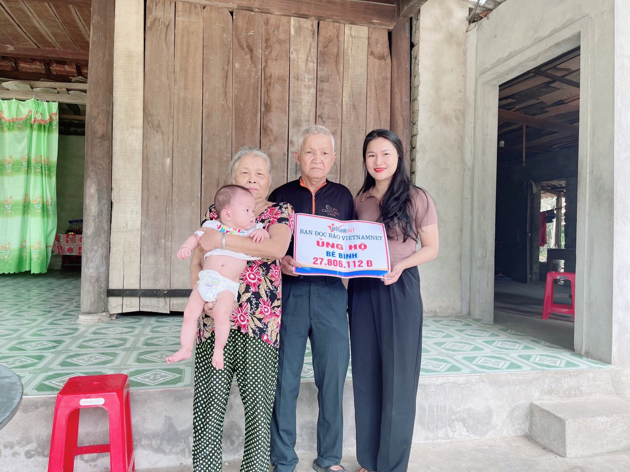 Mới đây, Báo VietNamNet tiếp tục trao đợt 2 số tiền hơn 27 triệu đồng tới bà ngoại của bé Phan Đình Bình (4 tháng tuổi, ở thôn Quang Lộc, xã Phú Gia, huyện Hương Khê (Hà Tĩnh). Trước đó, báo đã trao 510 triệu đồng là số tiền bạn đọc ủng hộ bé Bình.