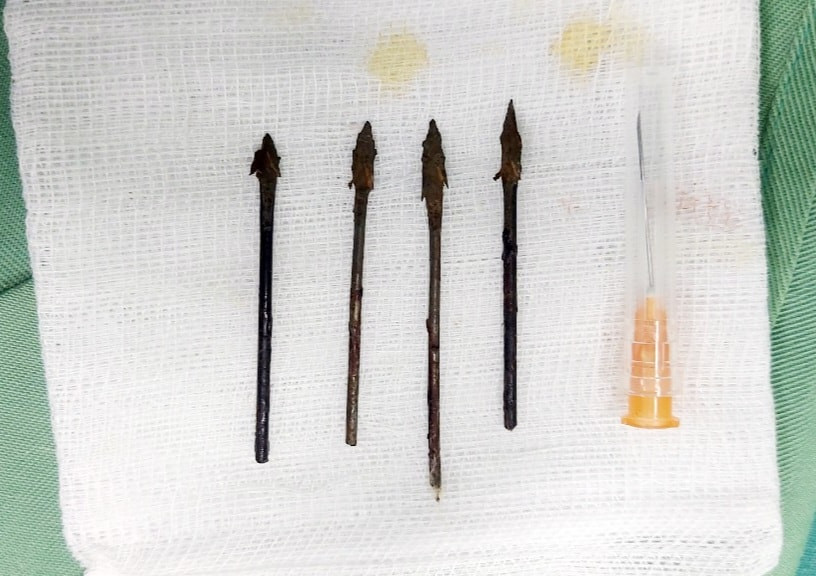 Bác sĩ Đoàn Nhân Chính, Phó trưởng khoa Tai Mũi Họng, phẫu thuật viên chính ca mổ cấp cứu, đánh giá đây là ca bệnh nguy hiểm, bởi vị trí 4 mũi tên chỉ cần dịch chuyển vào sâu, sang bên thêm một chút sẽ có thể gây tổn thương nhãn cầu hoặc tổn thương não.