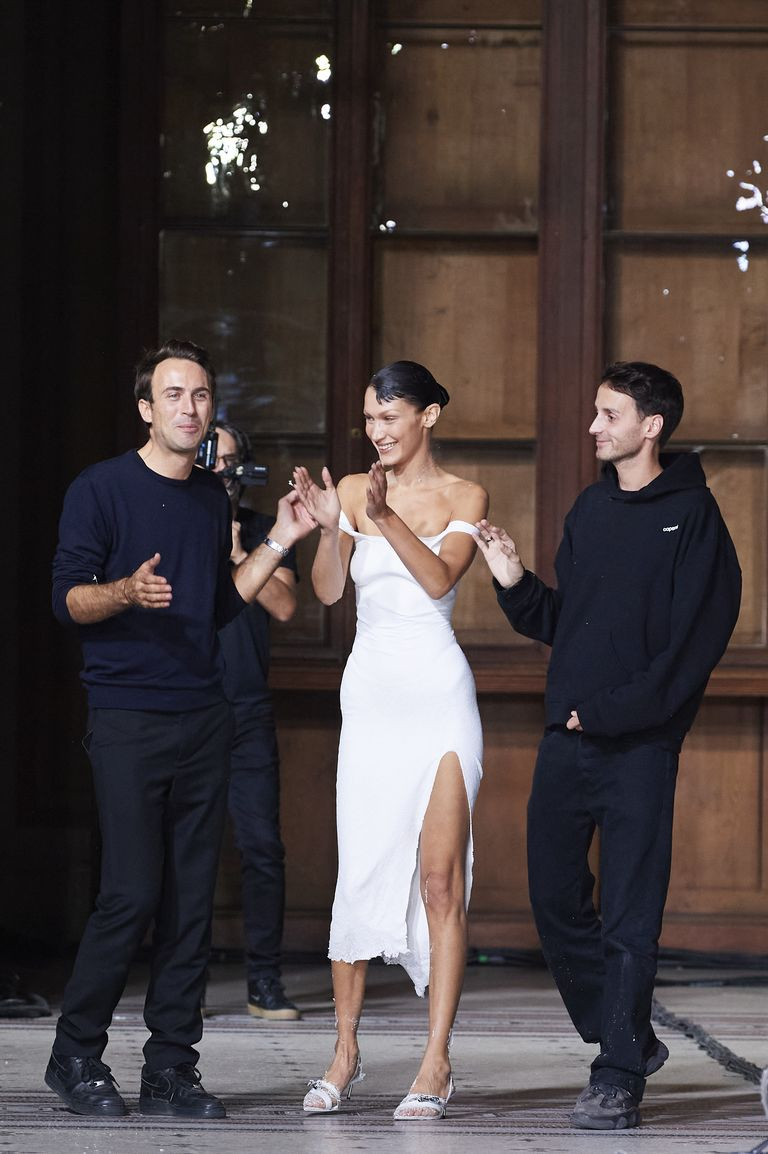 Trong kết màn show thời trang mùa xuân của thương hiệu Coperni ở Paris, Pháp hôm 30/9, Bella Hadid gây bất ngờ và chú ý khi để ngực trần bước lên sân khấu. Ngay sau đó, các nhà tạo mẫu đã dùng máy phun sơn lên khắp người cô để tạo ra một chiếc đầm trắng xinh đẹp.