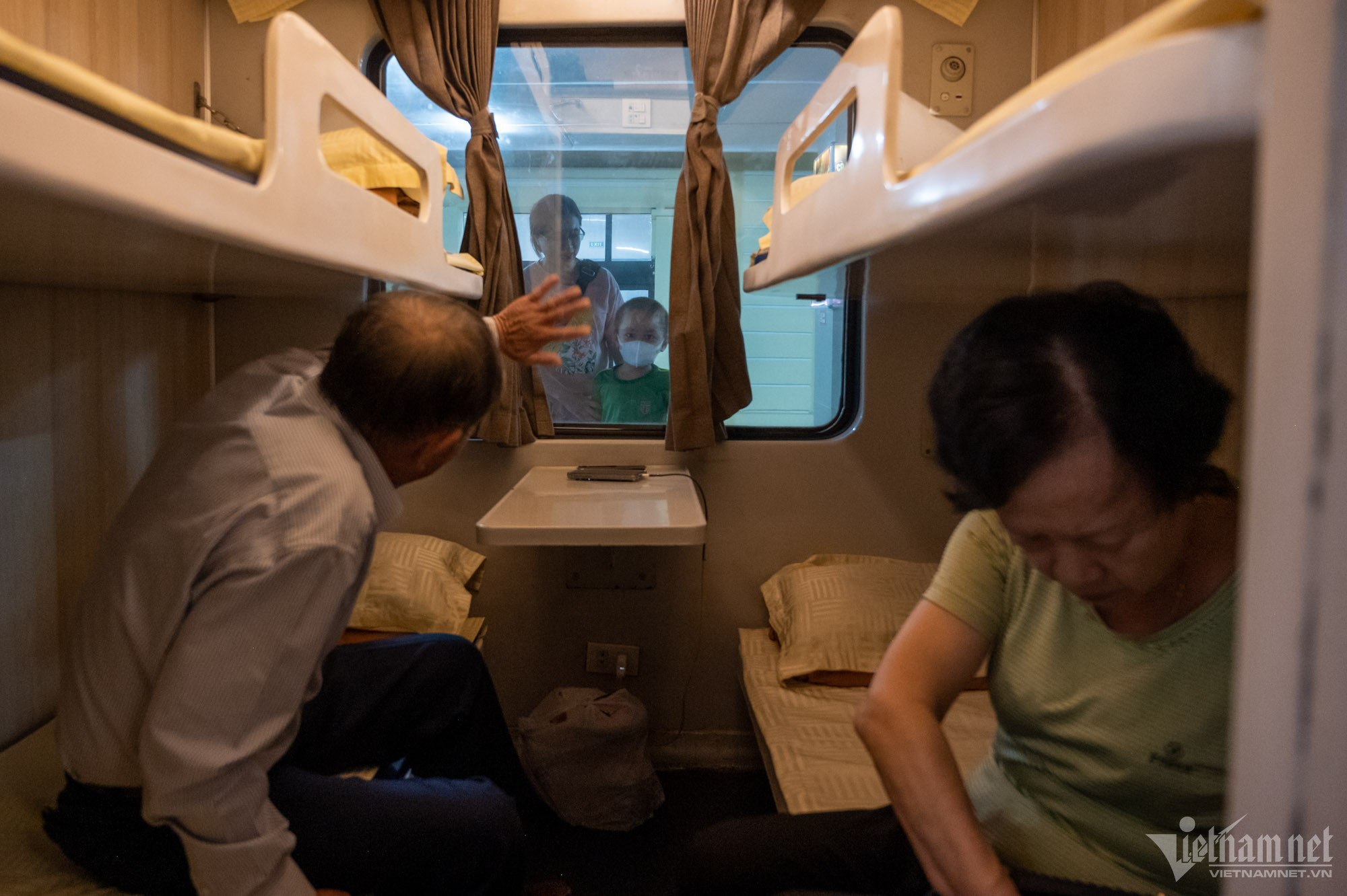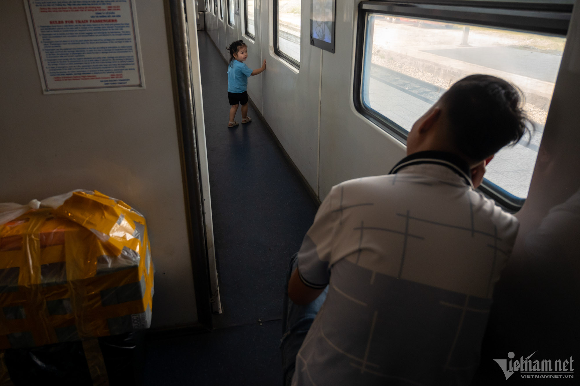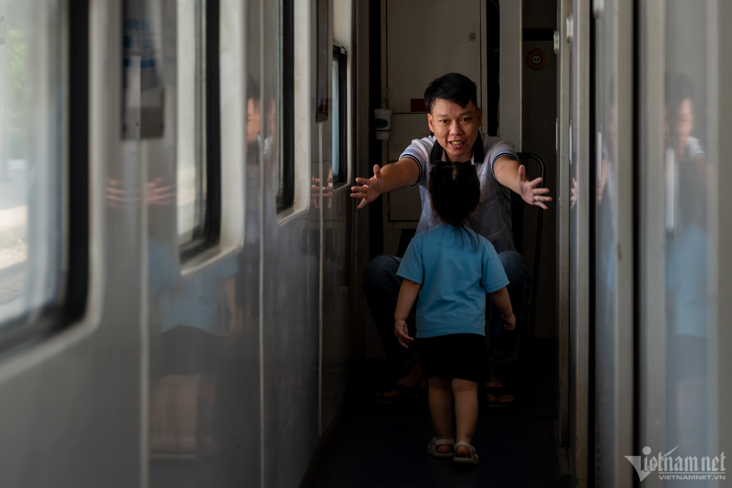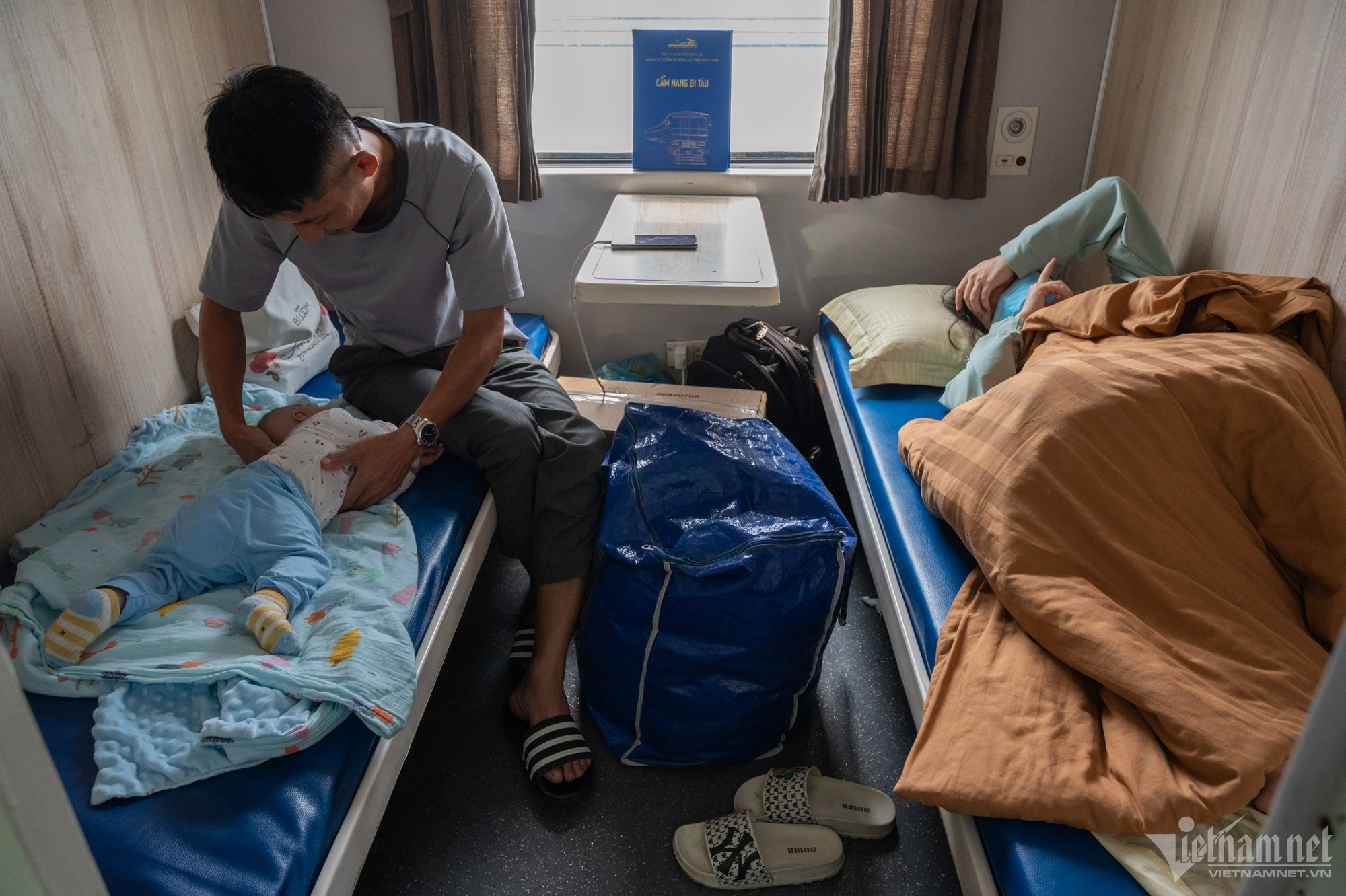 Trong một khoang giường nằm, phóng viên gặp gia đình anh Sơn đang di chuyển từ Huế vào quê ngoại Đà Nẵng. “Lên tàu là cháu tỉnh luôn, rồi nằm chơi nãy giờ", anh hứng thú nói về con gái của mình.