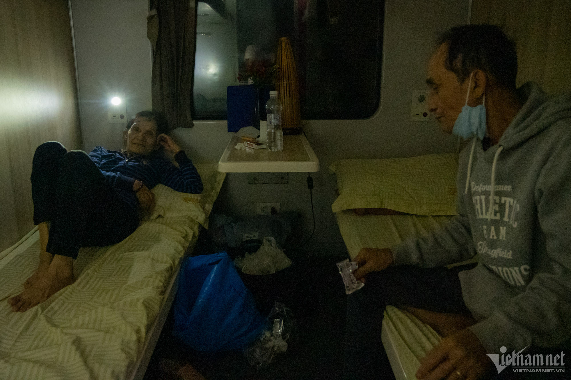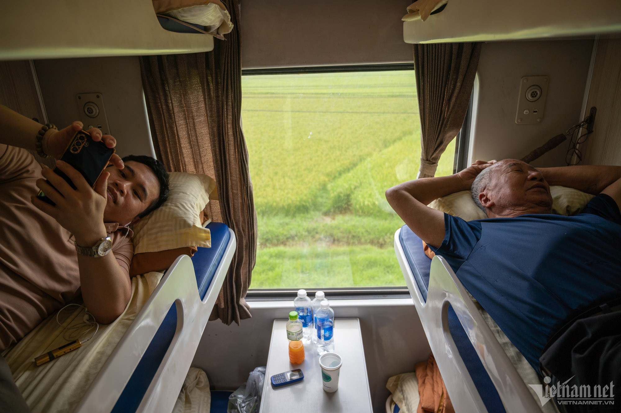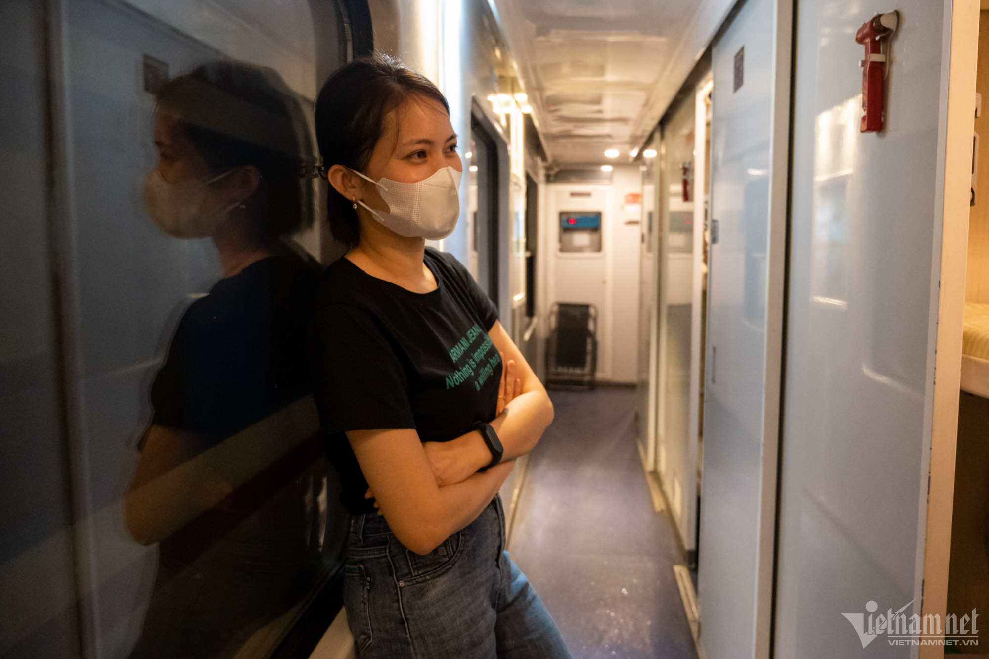 Trong một khoang giường nằm, phóng viên gặp gia đình anh Sơn đang di chuyển từ Huế vào quê ngoại Đà Nẵng. “Lên tàu là cháu tỉnh luôn, rồi nằm chơi nãy giờ", anh hứng thú nói về con gái của mình.