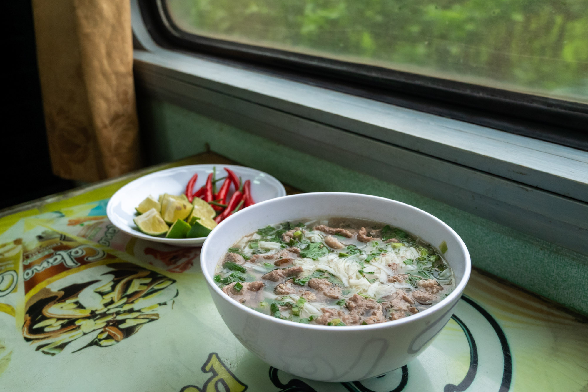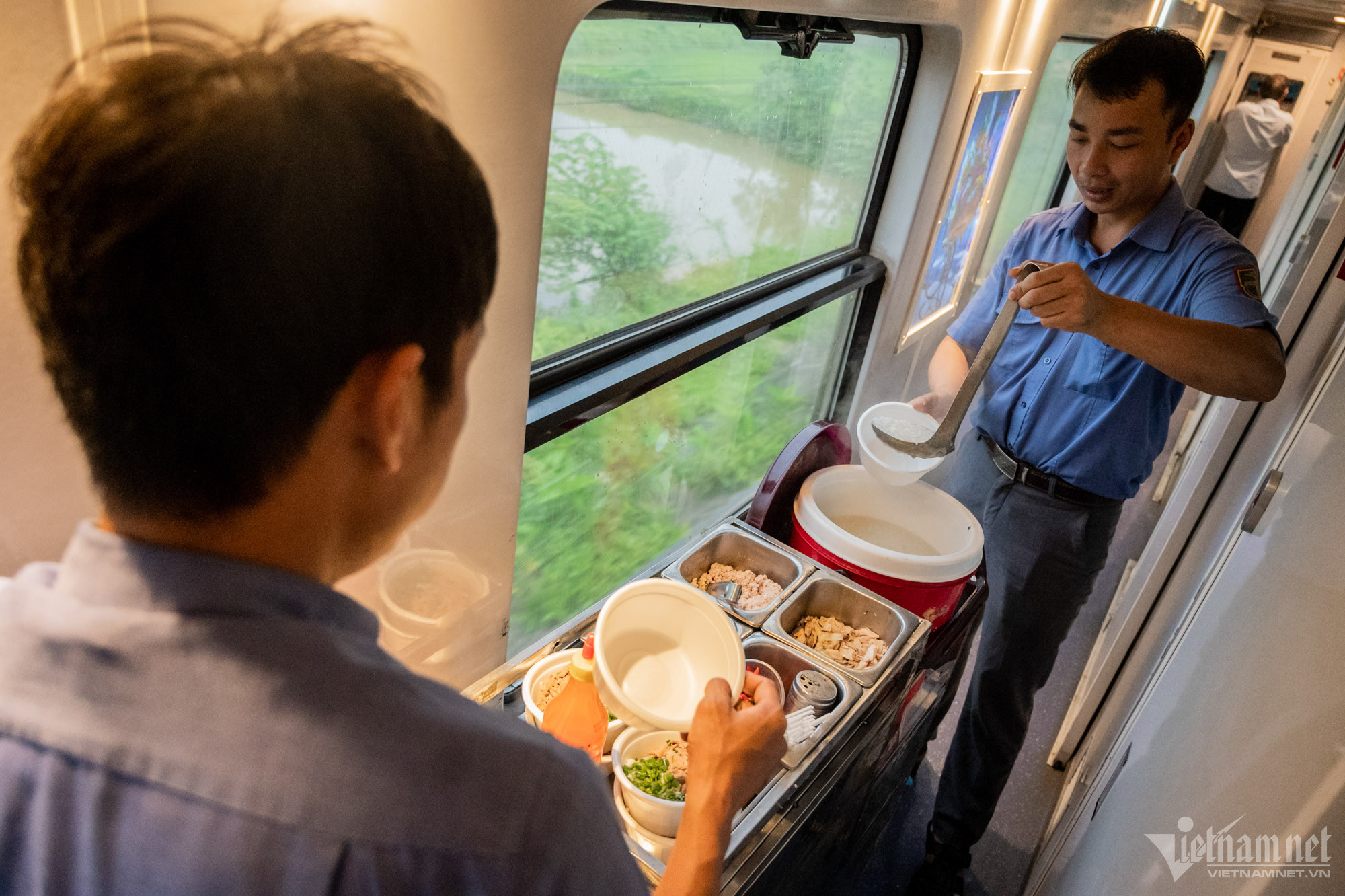 Trên tàu, việc ăn uống tương đối thuận tiện khi có tổ phục vụ. Nếu hành khách mang theo đồ ăn dễ dàng lấy nước nóng ở đầu toa, ngoài ra vẫn có thể mua hàng của nhân viên đường sắt vào mỗi giờ ăn trưa, tối, đêm hoặc bữa sáng. Các suất ăn được đặt trước, đa dạng từ cháo, cơm phần, bánh mì, phở... mỗi phần có giá từ 40.000 đồng.