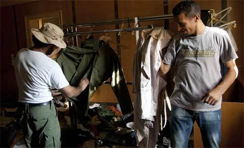 Hai tay súng nổi dậy kiểm tra quần áo thuộc về các thành viên gia đình Gaddafi. (Ảnh: AP)