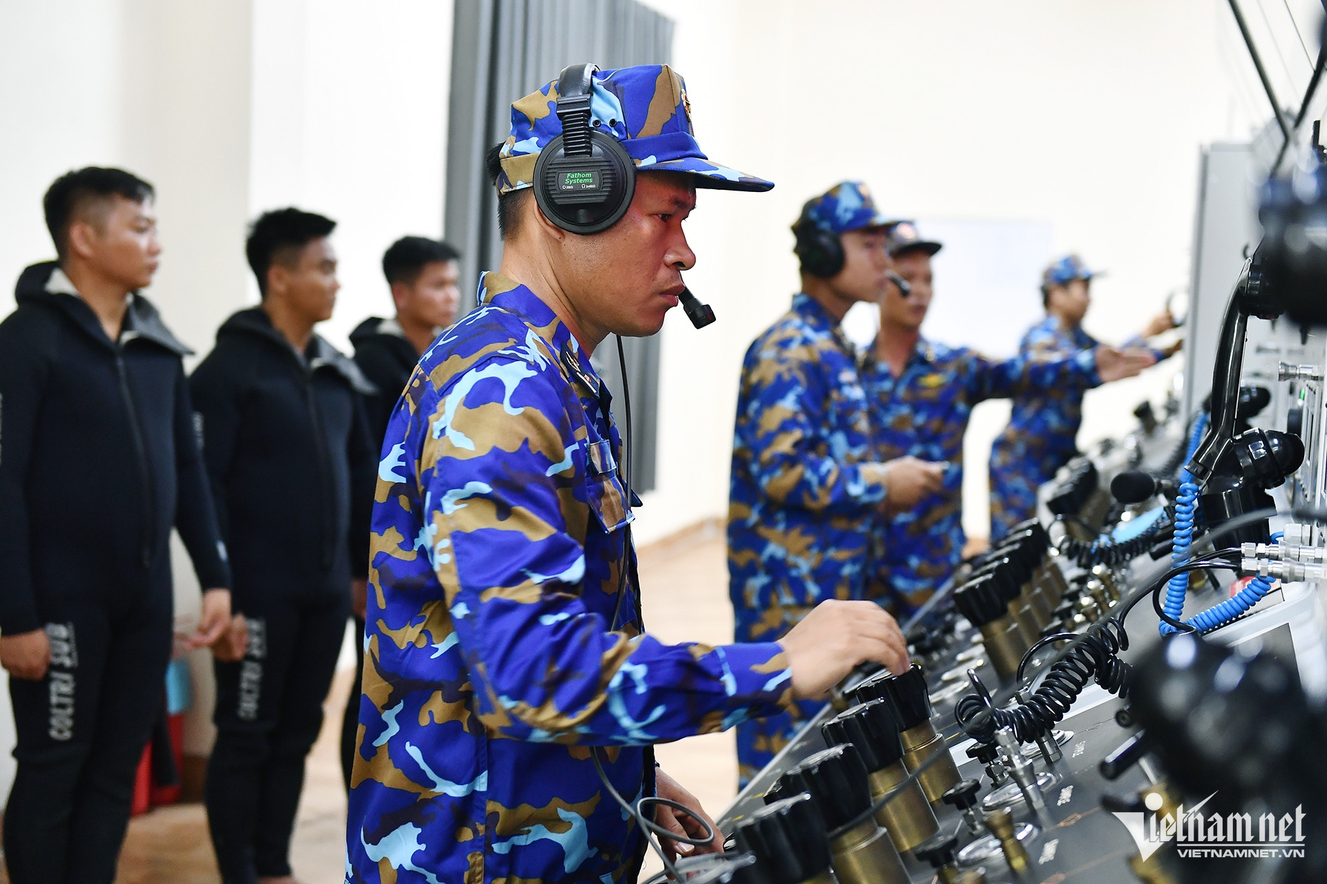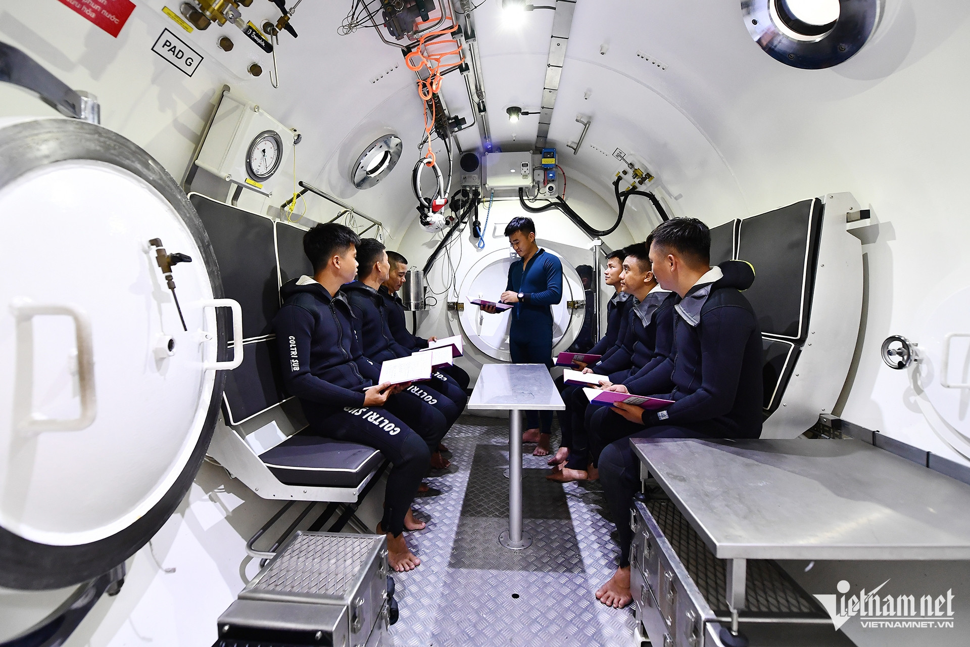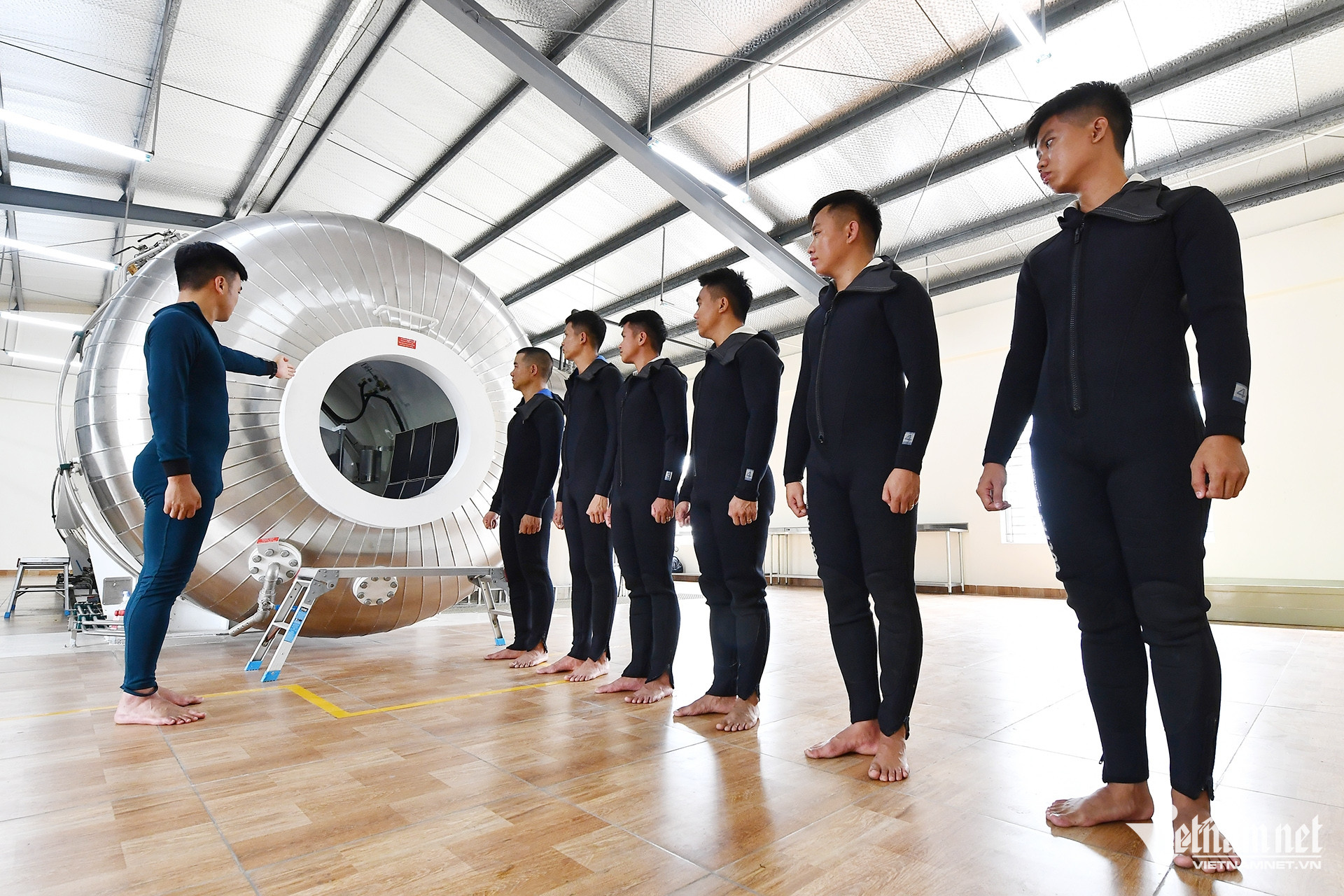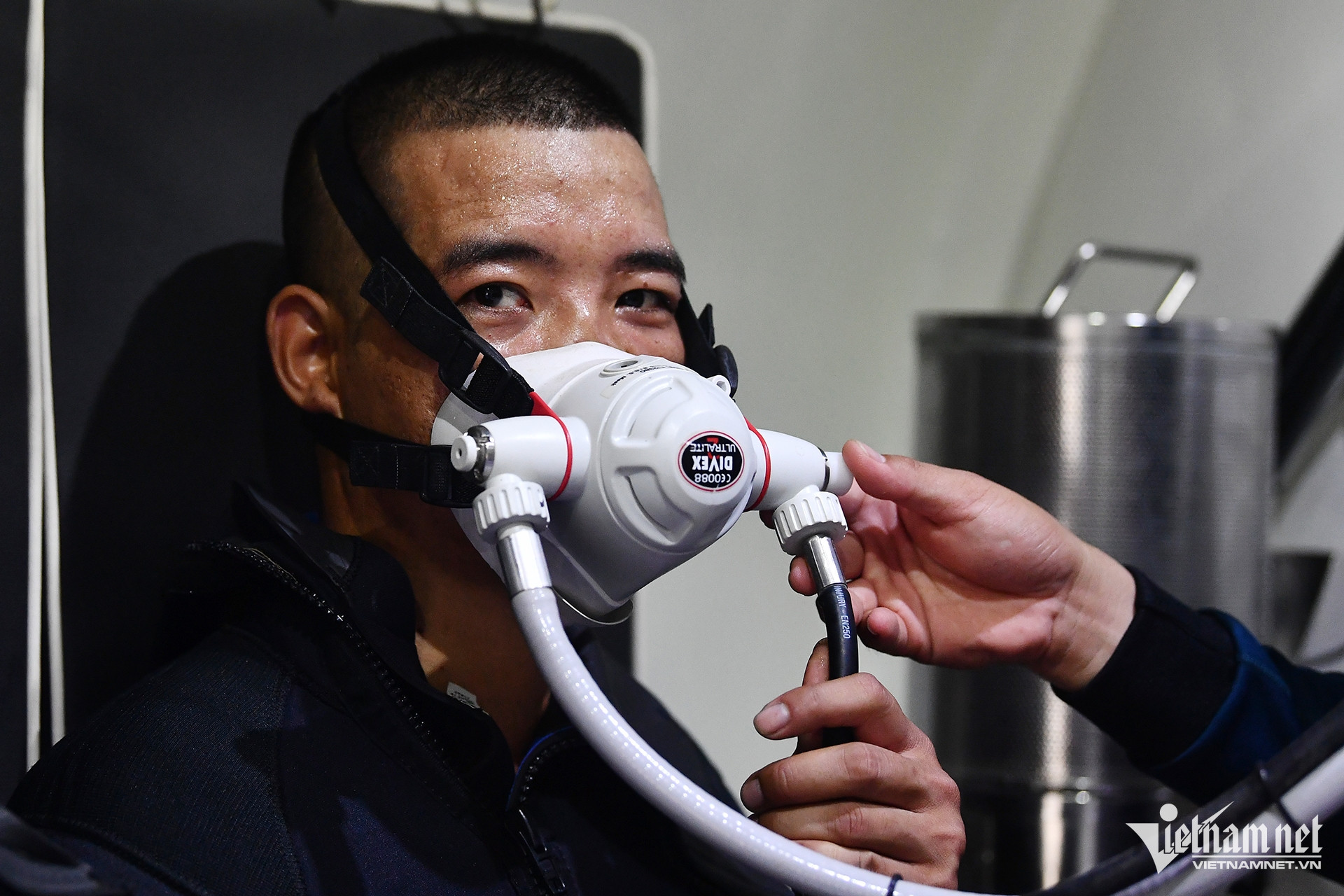 "Trong quá trình huấn luyện, áp suất trong hệ thống được điều chỉnh từ thấp đến cao, tương ứng với độ sâu dưới đáy biển. Các chiến sĩ phải sống, ăn, ngủ, luyện tập liên tục trong buồng lặn suốt nhiều ngày liền", Trung tá Thắng nói.