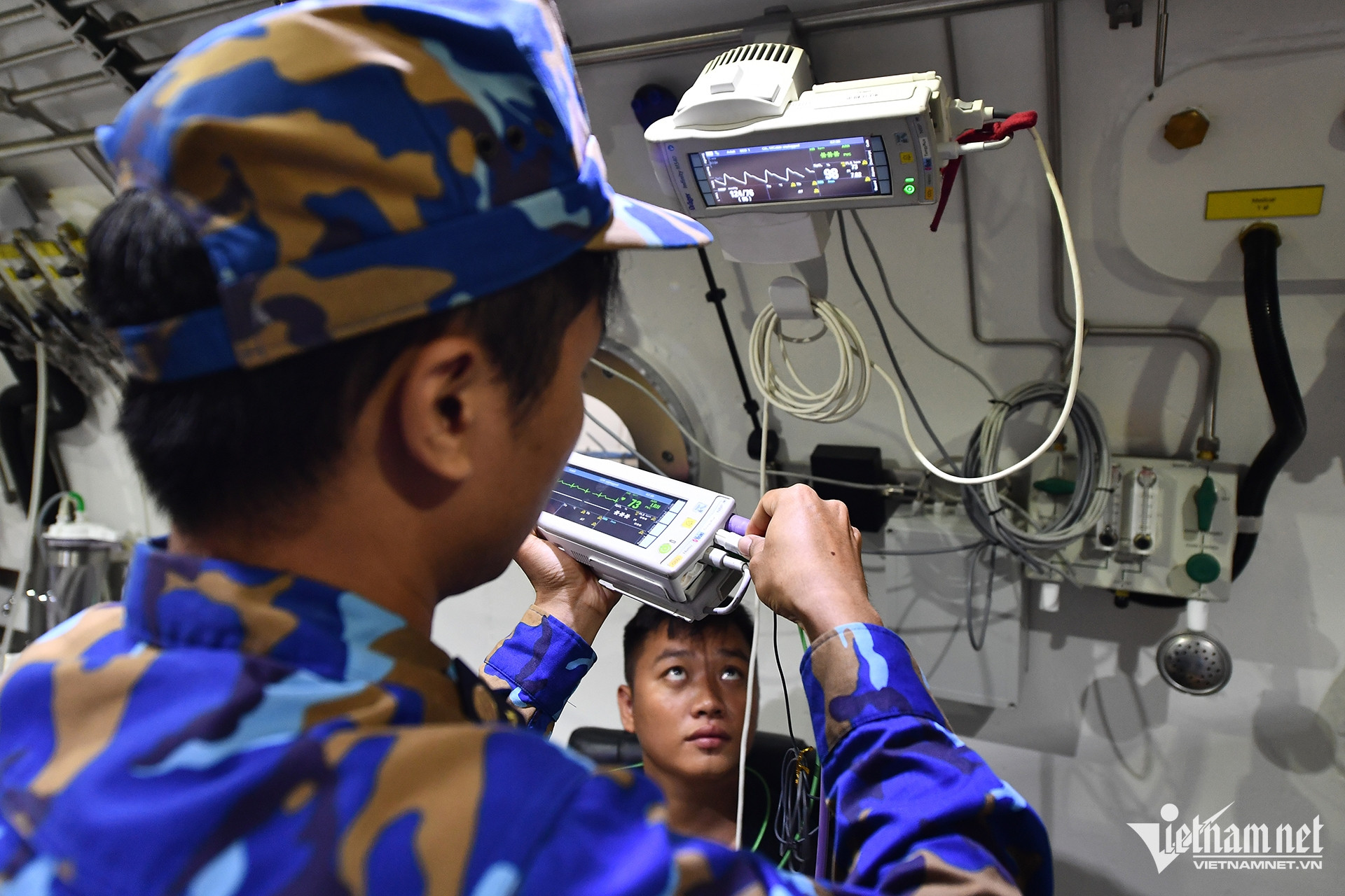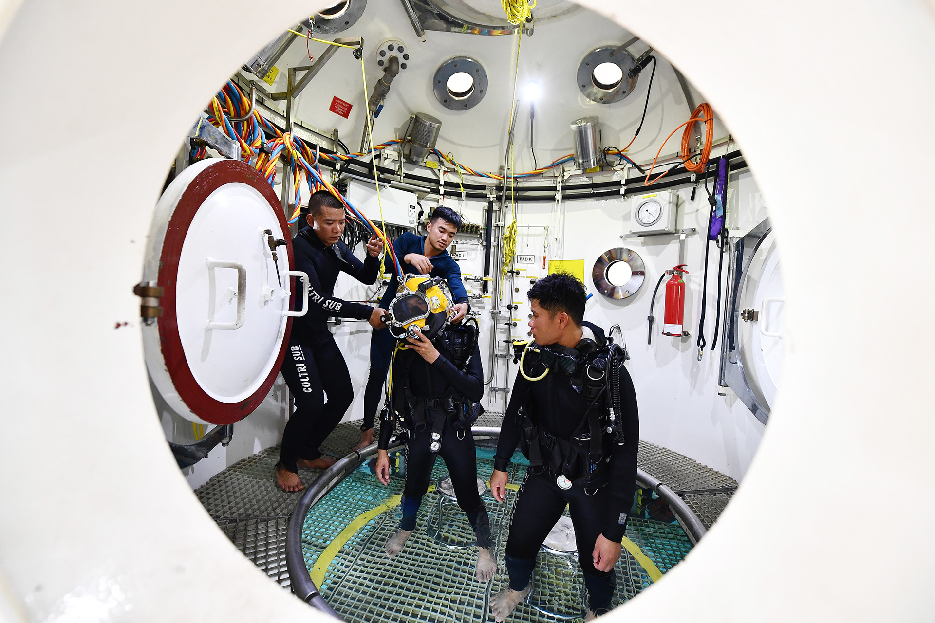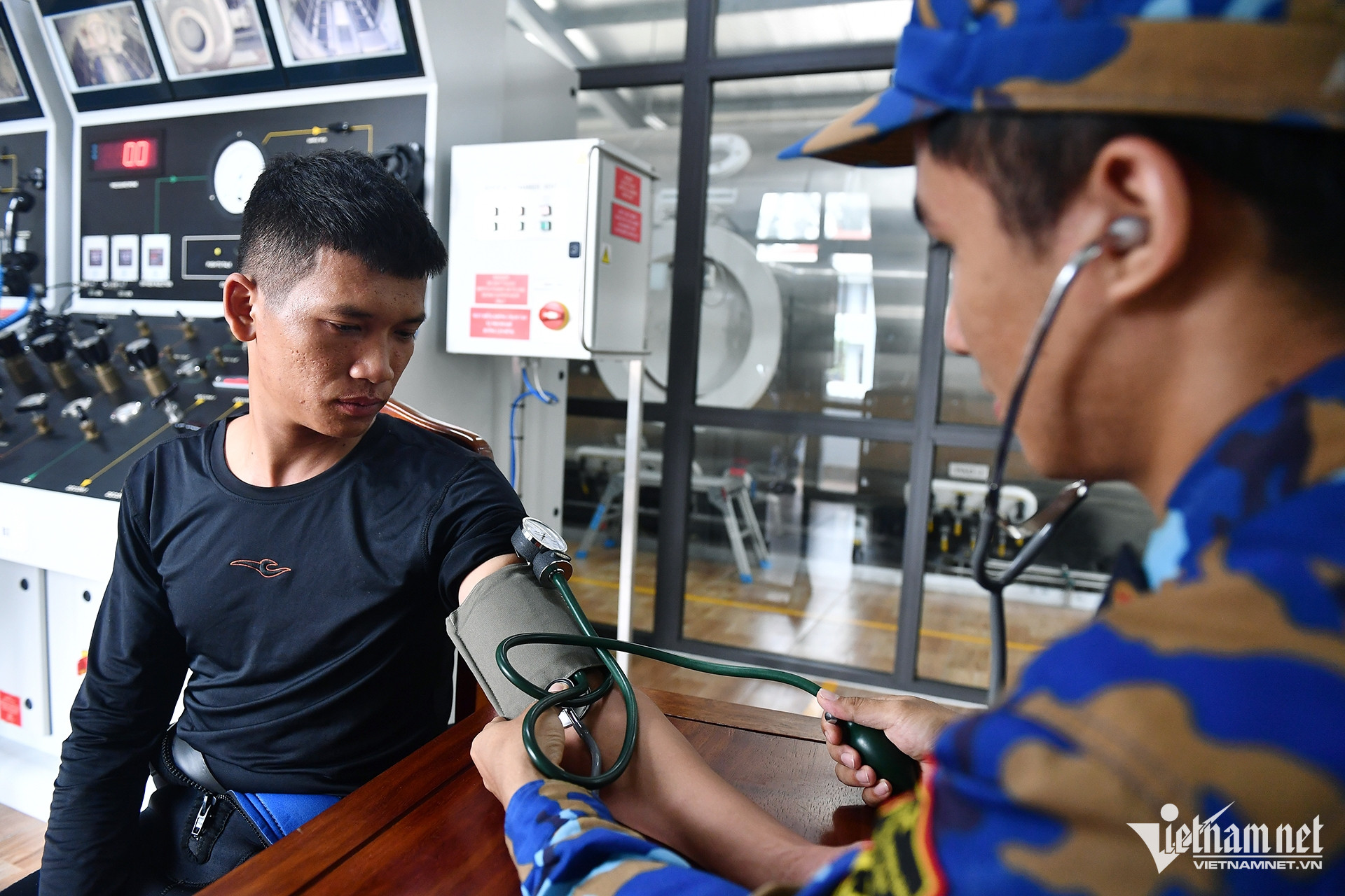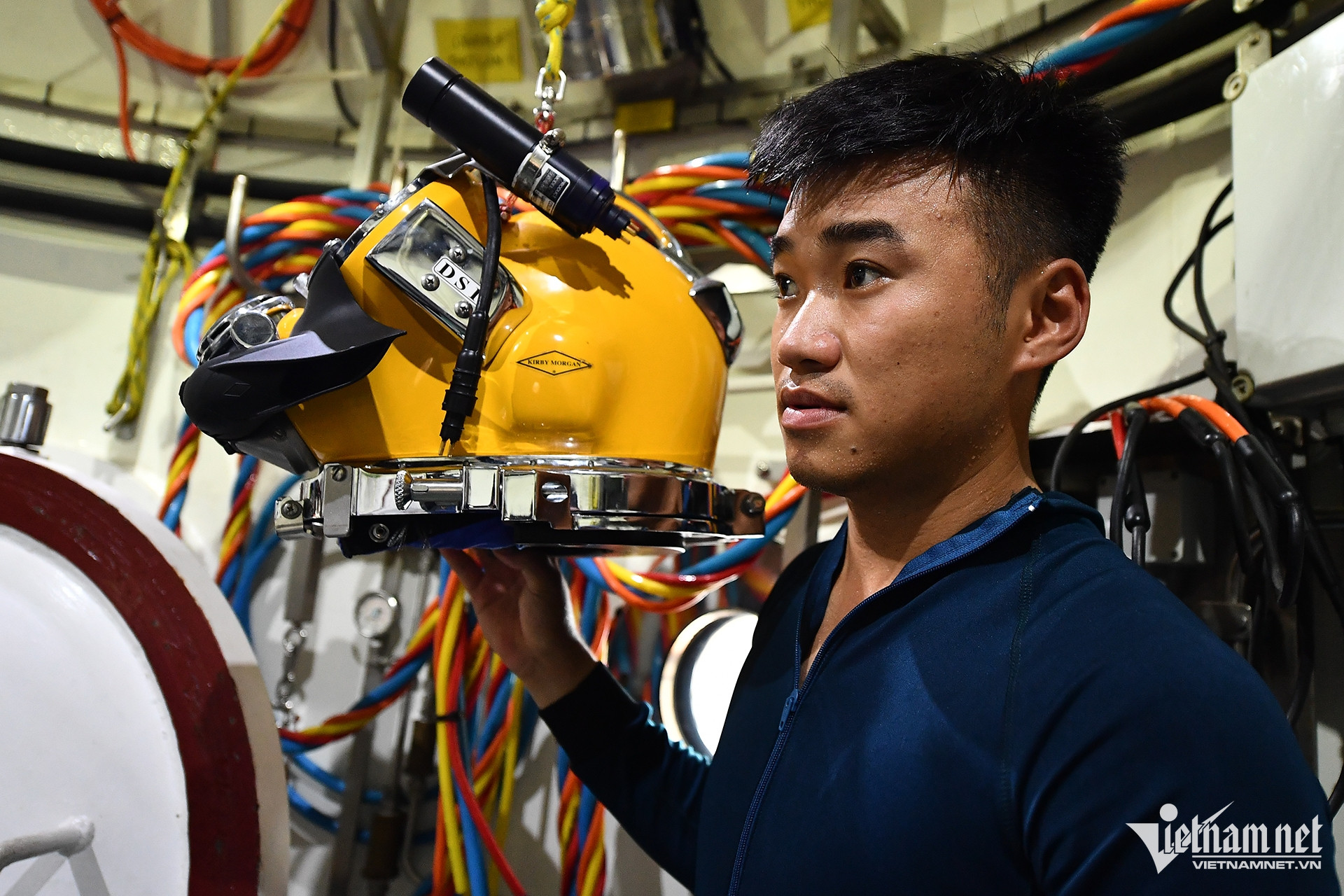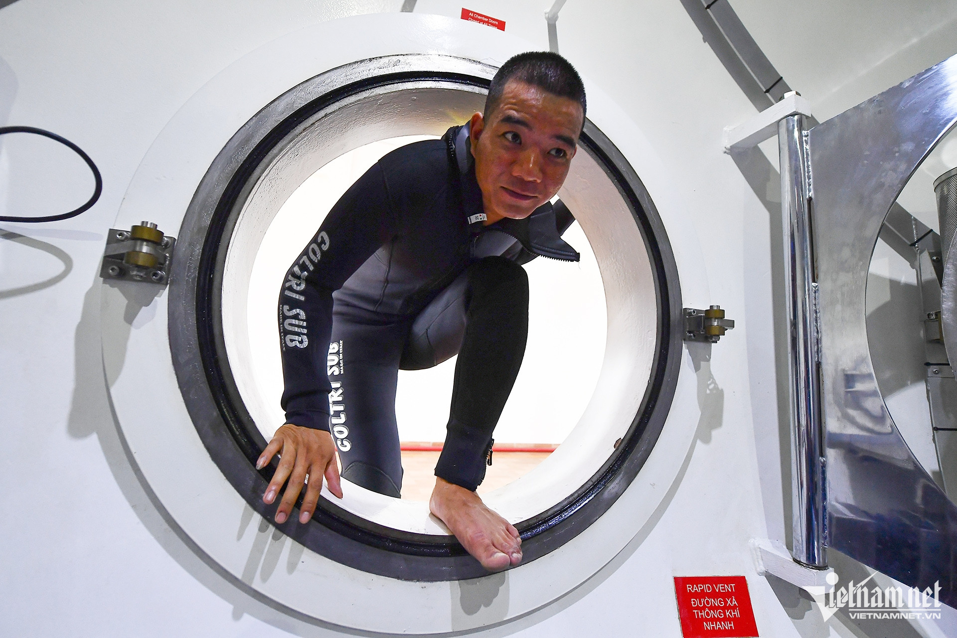 "Trong quá trình huấn luyện, áp suất trong hệ thống được điều chỉnh từ thấp đến cao, tương ứng với độ sâu dưới đáy biển. Các chiến sĩ phải sống, ăn, ngủ, luyện tập liên tục trong buồng lặn suốt nhiều ngày liền", Trung tá Thắng nói.