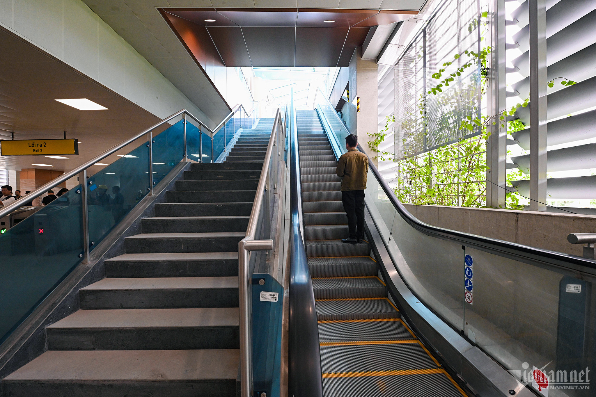 Hình ảnh tại ga Đại học Quốc gia trên đường Xuân Thủy. Nhìn bề ngoài, ga được thiết kế tổng thể hình cánh chim hòa bình, bao quanh là thảm cây xanh, được trồng và tưới nước tự động.
