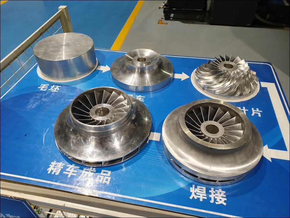 Từ một miếng kim loại nguyên khối, các công đoạn sản xuất sẽ cho ra những cánh quạt như vầy sử dụng trong máy nén li tâm. |