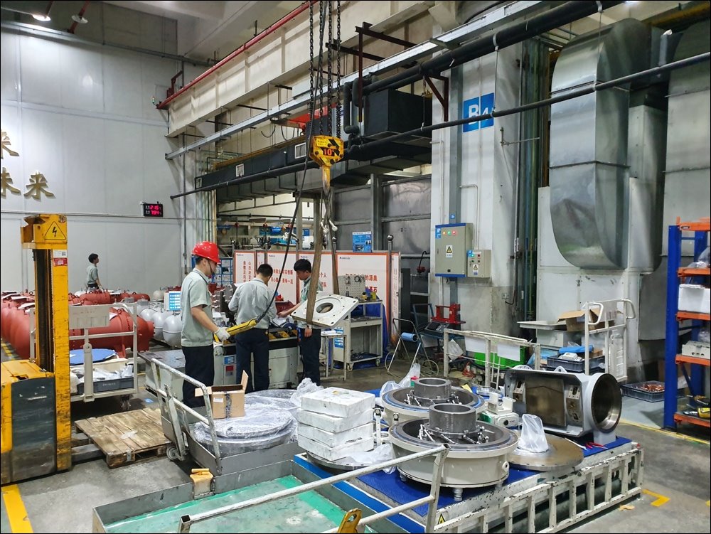 Công nhân được sự hỗ trợ của máy móc khi vận chuyển, kiểm tra các linh kiện kim loại lớn. |