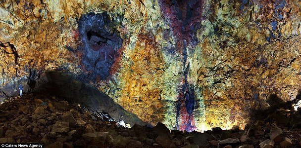 ...với những bức tường đá nhiều màu sắc được tạo ra bởi dung nham nóng chảy.