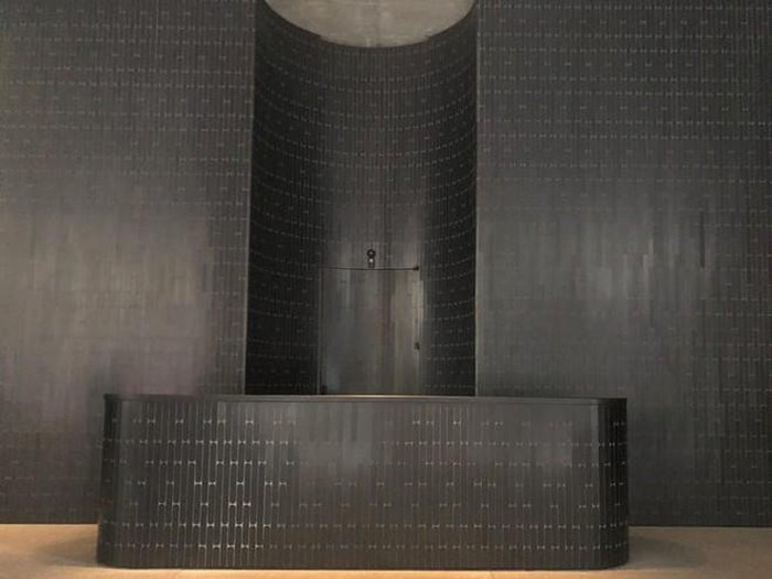Tiền sảnh rộng rãi với những đường nét mềm mại và sắc nét, tương phản hoàn toàn so với bên ngoài của tòa nhà.