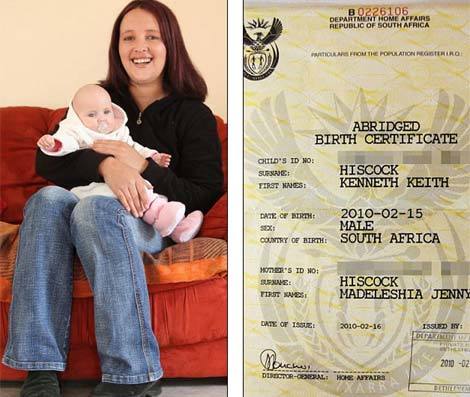 Bé Kenneth Hiscock dường như sở hữu bộ phận sinh dục nam khi mới chào đời vào giữa tháng 2/2010 và ngay cả các bác sĩ đỡ đẻ cũng xác nhận em là con trai. Bố mẹ của bé - cô Madeleshia, 29 tuổi và chồng Kenneth, 30 tuổi - đã tự hào thông báo với toàn thể gia đình và bạn bè rằng họ vừa có đứa con trai đầu tiên.