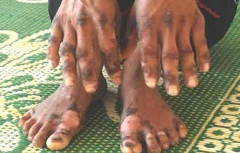 Những dấu hiệu rõ ràng nhất với những bệnh nhân mắc căn bệnh này là miệng lở loét, bàn tay, bàn chân nổi các lớp vảy dày giống như vết bỏng.