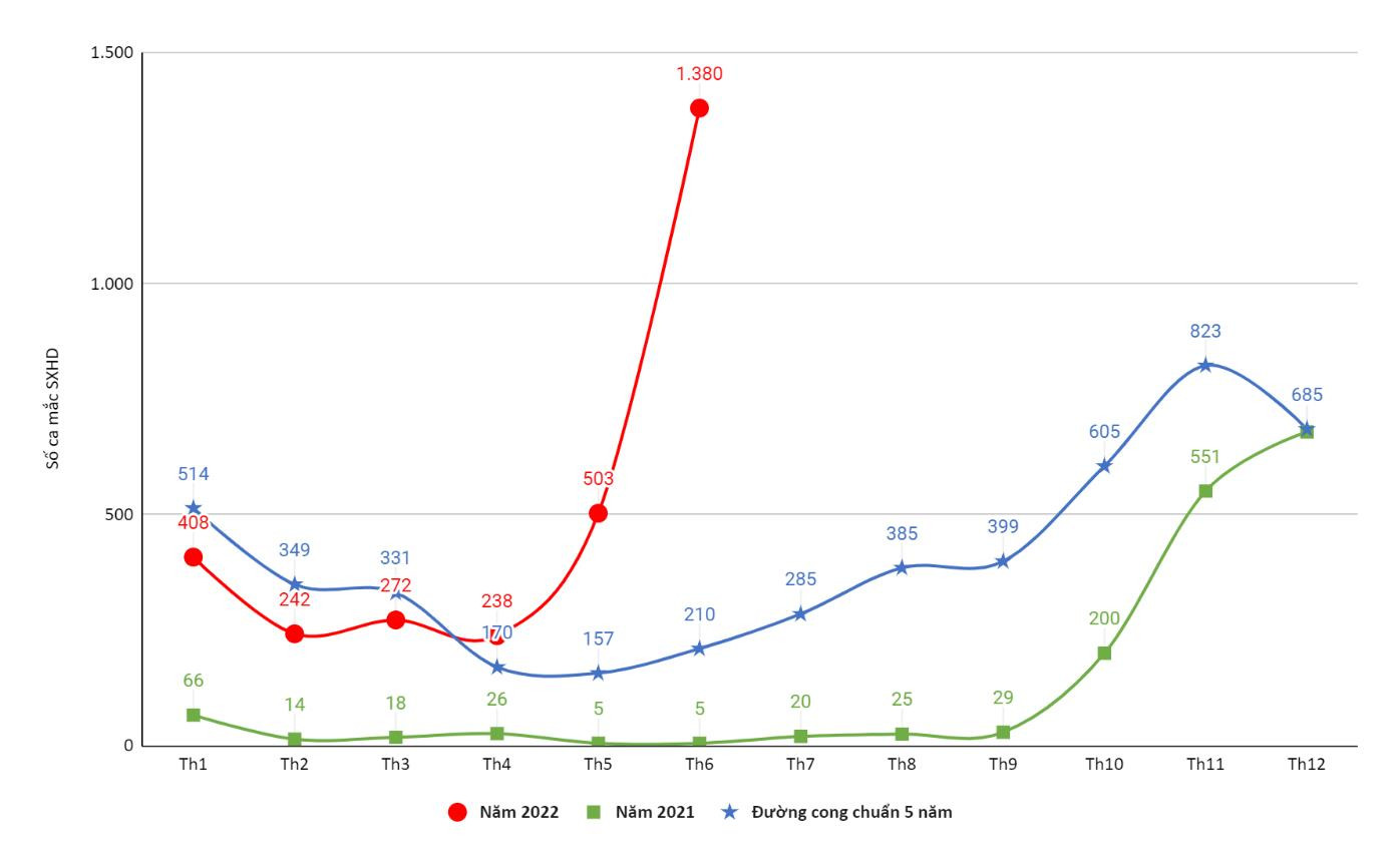 Số ca mắc sốt xuất huyết tại Đà Nẵng đang gia tăng từ tháng 4 và đã vượt ngưỡng đường cong chuẩn 5 năm (2016-2020), hiện đang đạt số lượng ca cao nhất trong tháng 6 với 1.380 ca (tính từ ngày 1/1 đến 3/7).