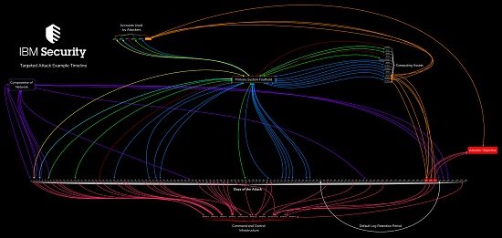 IBM cung cấp một hình ảnh minh họa cho một cuộc tấn công thực tế diễn ra trong 120 vào một công ty thuộc top Fortune 500 từ góc nhìn của nhóm tội phạm thực hiện nó (Xem hình lớn tại đây). Mục tiêu của cuộc tấn công này là đánh cắp và phá hủy dữ liệu, các màu sắc khác nhau đại diện cho các chức năng khác nhau, theo chuyên gia Christopher Scott thuộc nhóm X-Force của IBM. Bên trái hình minh họa, các kẻ tấn công tập trung vào làm tổn thương mạng lưới doanh nghiệp để đặt chỗ đứng trong tổ chức doanh nghiệp. Những đối tượng còn lại tấn công vào các tài khoản nhân viên để đánh cắp dữ liệu cá nhân, từ đó tiếp cận vào các vùng thông tin nhạy cảm. Khoảng trống giữa dòng thời gian cho thấy các giai đoạn hacker tạm ngưng hành động nhằm tránh các cảm biến nhằm phát hiện bất thường của các công ty. Sau khi 120 ngày kết thúc, các đối tượng khác, biểu hiện bằng màu đỏ tươi, xuất hiện và hoàn thành công việc, sử dụng nhiều loại mã độc để xóa sạch dấu vết cũng như dữ liệu công ty.