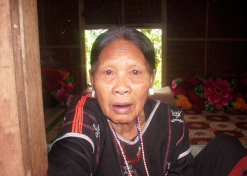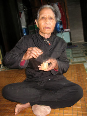 Cụ Tuyết dẫn chúng tôi đến nhà cụ Cả Ngoan (85 tuổi, làng Pe Dụt, xã Hồng Trung). Cụ Ngoan là người hiếm hoi còn nhớ rõ về tục mài, nhuộn răng.