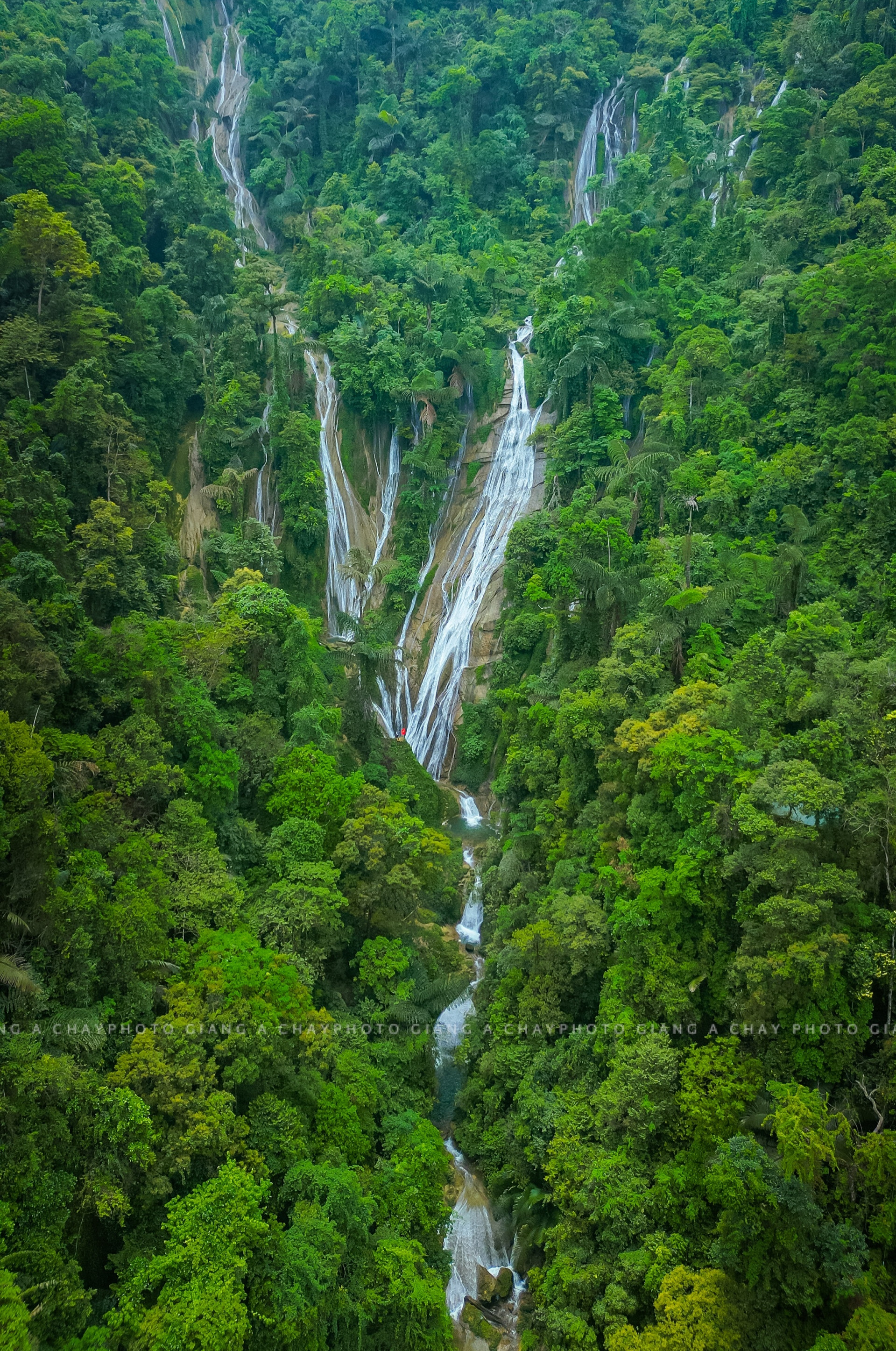 Thác rất cao và chia thành nhiều tầng nối tiếp nhau. Tầng thác trên cao có lưu lượng nước lớn, trải rộng, dàn đều như một dải lụa trắng nổi bật giữa màu xanh của núi rừng đại ngàn.