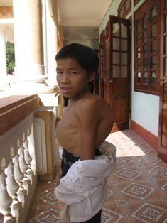 Năm nay, Hiếu 14 tuổi nhưng trông em nhỏ thó như học sinh cấp 1. Hơn nữa, Hiếu còn bị bệnh bẩm sinh khiến cơ thể khá kì dị: lưng nổi hạch rất to, bụng chướng và hông tóp lại nhìn rất tội.