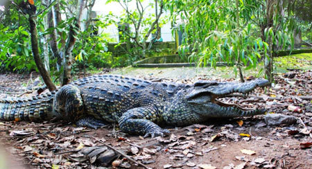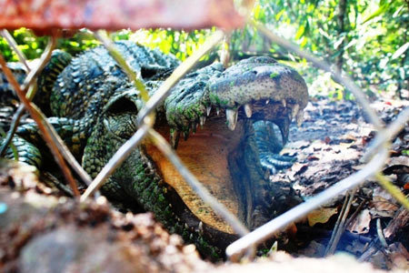 | Con cá sấu hung dữ nằm sát lưới bảo vệ đã cũ kỹ và không kém phần nguy hiểm |