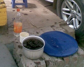 Vì xô nước được nấp sau gốc cây nên chốc chốc, chị L. lại vô tư mang vỏ chai Coca Cola vào và sục thẳng xuống xô nước để đổ đầy bình. Giả vờ nghe điện thoại, tôi tiếp tục tiến sâu vào trong ngõ để tìm hiểu nguyên liệu pha trà ở đây. Trong 1 góc nhỏ được bao bọc bởi các tấm bìa và xốp là một bếp than tổ ong, bên trên là một nồi nước chè tươi đang sôi sùng sục, cũng không có nắp đậy.