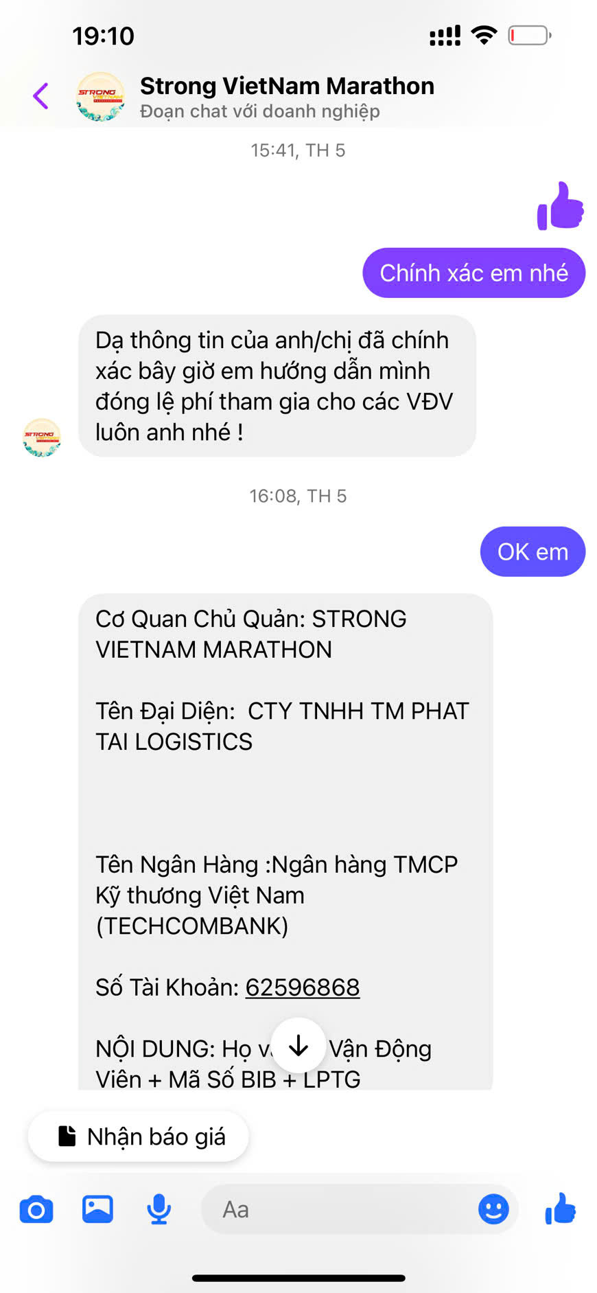 Trong quá trình tư vấn, anh B. được giải thích do ảnh hưởng của cơn bão số 3 vừa qua nên giảm 50% giá vé cho tất cả các cự ly. Với cự ly 10km, anh B. được yêu cầu đóng lệ phí là 390.000 đồng vào tài khoản ngân hàng có tên CTY TNHH TM PHAT TAI LOGISTICS. Sau đó, tiếp tục chuyển ra làm việc riêng với Facebook cá nhân Nguyễn Minh Khang, người tự nhận mình là chuyên viên Đài Truyền hình Việt Nam.