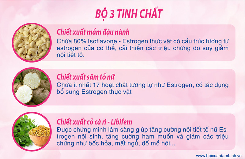 Bên cạnh đó, bộ ba tinh chất chiết xuất mầm đậu nành, sâm tố nữ và Libifem (chiết xuất cỏ cà ri) cũng là “điểm sáng” của bảng thành phần TPBVSK Hồi Xuân Tâm Bình. Chiết xuất mầm đậu nành và sâm tố nữ giúp cơ thể bổ sung Estrogen thực vật, hợp chất có cấu trúc tương tự như Estrogen trong cơ thể. Trong khi đó Libifem làm tăng Estrogen nội sinh.