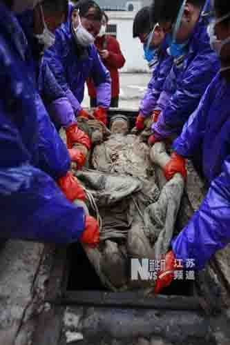 | Các nhân viên bảo tàng Thái Châu đưa xác ướp ra khỏi quan tài |