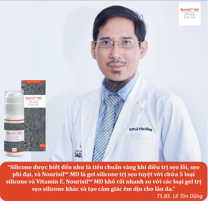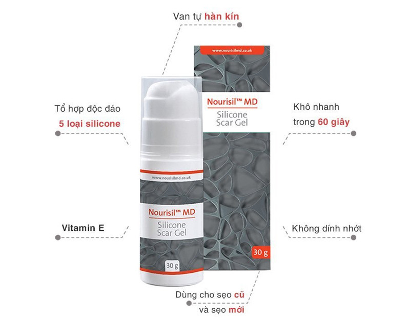 Cũng theo dược sĩ Trịnh Kim Hoà, gel silicone Nourisil™ MD chứa 5 loại silicone và vitamin E, giúp ngăn ngừa và quản lý sẹo lồi và sẹo phì đại do các thủ thuật phẫu thuật nói chung, do vết thương, chấn thương hoặc bỏng.