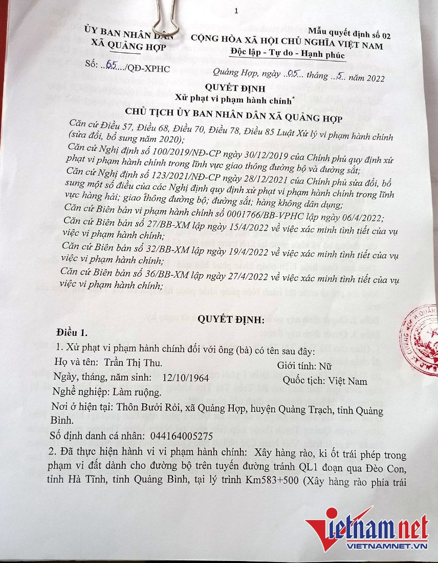 Báo VietnamNet vừa có bài “Vợ Phó Bí thư xã ở Quảng Bình xây công trình trái phép chờ đền bù cao tốc”, phản ánh bà Trần Thị Thu là vợ của Phó Bí thư Đảng ủy xã Quảng Hợp Nguyễn Thanh Hương xây dựng công trình chờ đền bù dự án cao tốc.