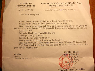 Và đến khi làm hồ sơ để hưởng chế độ thương binh, ông Lục cũng không trực tiếp đơn vị là Sư đoàn 312 để xin lại hồ sơ hoặc xác nhận bị thương trong chiến đấu, mà nhờ vào sự xác nhận của hai quân nhân khác rồi chứng nhận của Bộ Chỉ huy quân sự tỉnh Hà Tĩnh lúc bấy giờ.