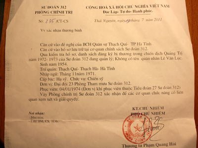 tin đáng chú ý trong hồ sơ thương binh của ông Lục. Một là việc ông Lục có khai