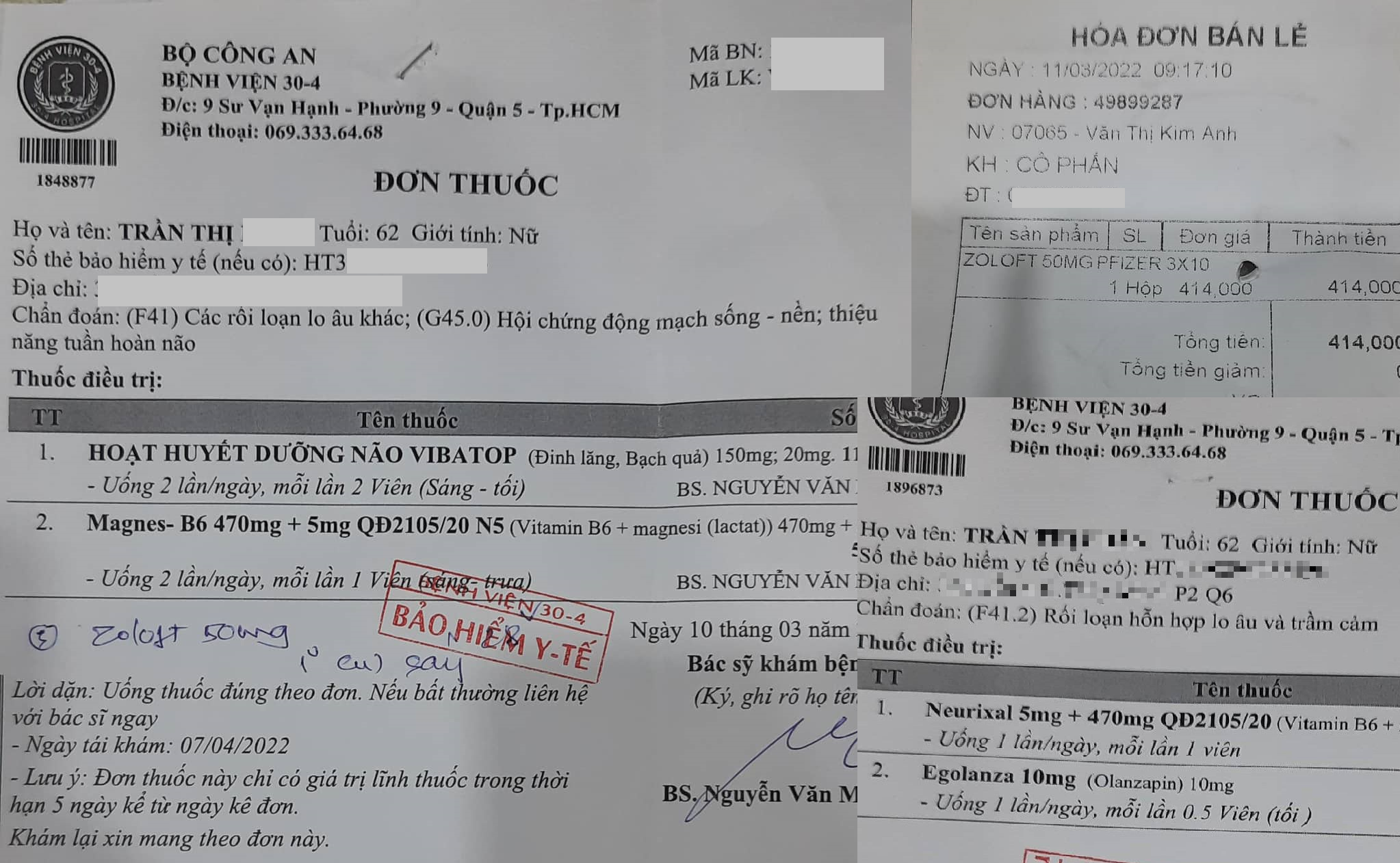 Tháng 2/2022, toa thuốc của bà P. có 4 loại thuốc. Tháng 3/2022, toa chỉ còn 2 loại (vitamin và hoạt huyết dưỡng não), thiếu thuốc đặc trị trầm cảm. Tình trạng kéo dài đến tháng 5/2022, toa thuốc thiếu luôn cả hoạt huyết dưỡng não.