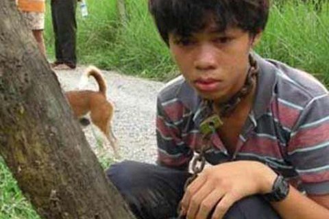 Cậu bé bị bố xích vào cây vì ham chơi điện tử. Ảnh: Internet