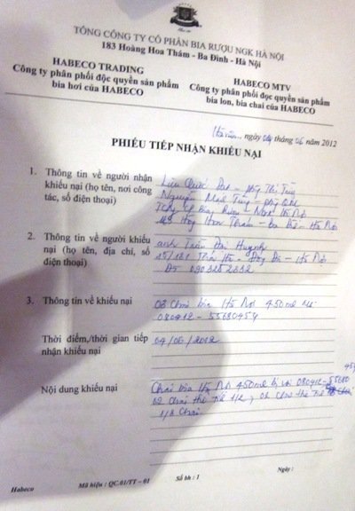 Phía công ty Habeco đã tiến hành lập biên bản tiếp nhận khiếu nại của khách hàng, đồng thời nhận một chai bia trong số 3 chai bị đong thiếu (số 080412-55680453) để làm mẫu kiểm nghiệm.