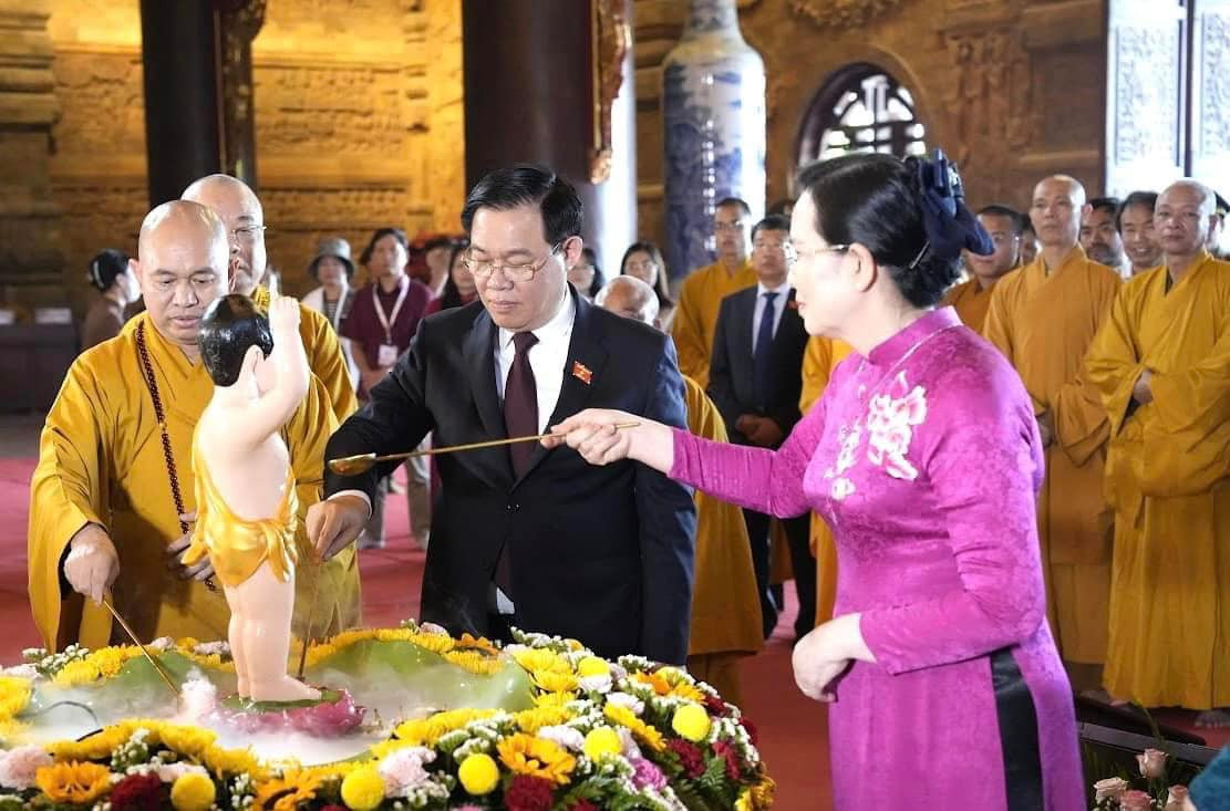 Chủ tịch Quốc hội Vương Đình Huệ và Đại sứ đặc mệnh toàn quyền Nhật Bản tại Việt Nam Yamada Takio tới thăm, dâng hương và khai thanh Đại Hồng Chung cầu nguyện quốc thái dân an tại chùa Tam Chúc.