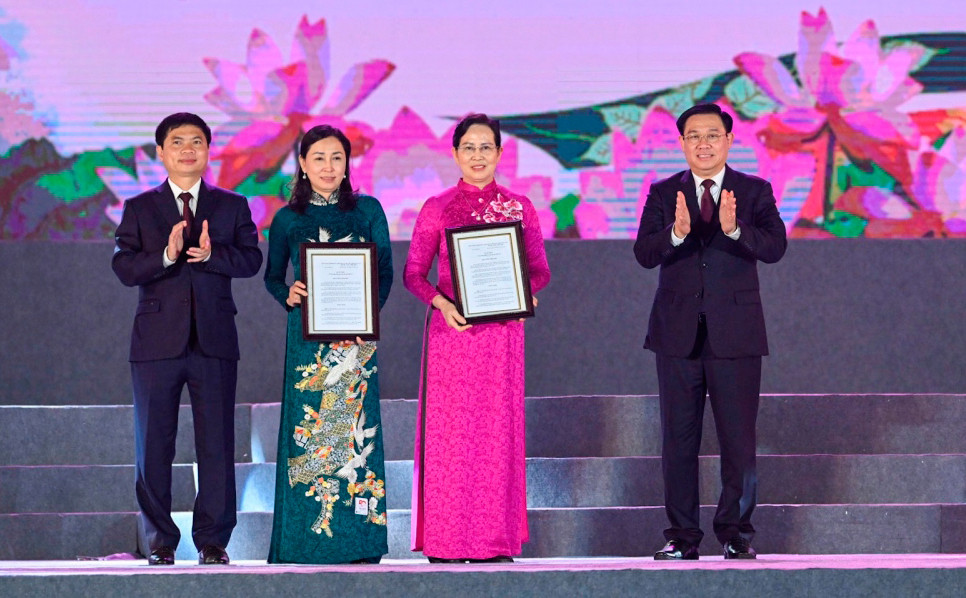 Chủ tịch Quốc hội Vương Đình Huệ trao quyết định công nhận 2 Bảo vật quốc gia cho tỉnh Hà Nam.