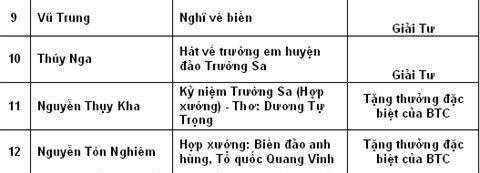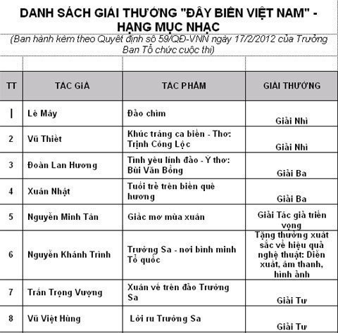 Trước đó, Ban Văn hóa báo VietNamNet đã giới thiệu các tác phẩm đoạt giải Nhì cuộc thi ĐBVN: "Đảo chìm" của tác giả Lê Mây; tác phẩm đoạt giải Nhì: "Khúc tráng ca biển"- tác giả Vũ Thiết; tác phẩm đoạt giải Ba: "Tình yêu lính đảo" - tác giả: Đoàn Lan Hương, tác phẩm đoạt giải "Tác giả triển vọng": "Giấc mơ mùa xuân" - Nguyễn Minh Tân và tác phẩm nhận Tặng thưởng xuất sắc về hiệu quả nghệ thuật: Diễn xuất, âm thanh hình ảnh "Trường Sa nơi bình minh Tổ quốc" - Nguyễn Khánh Trình.