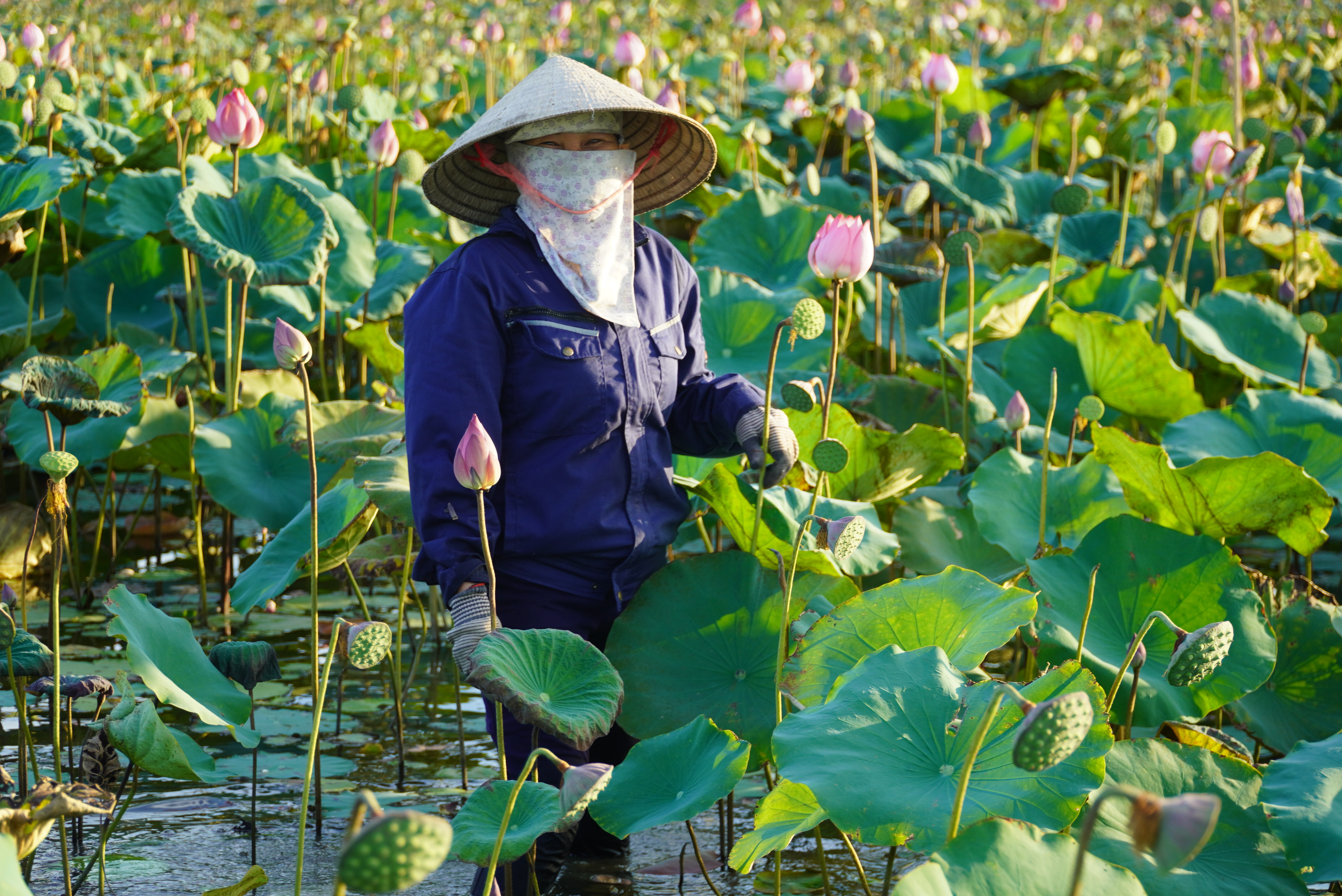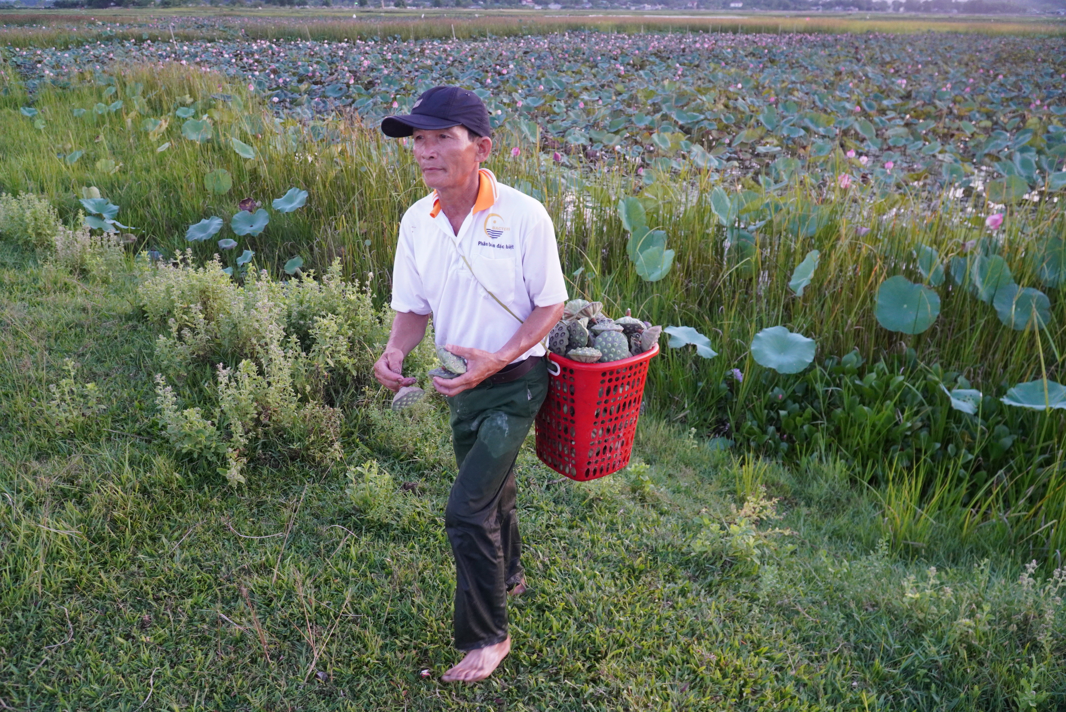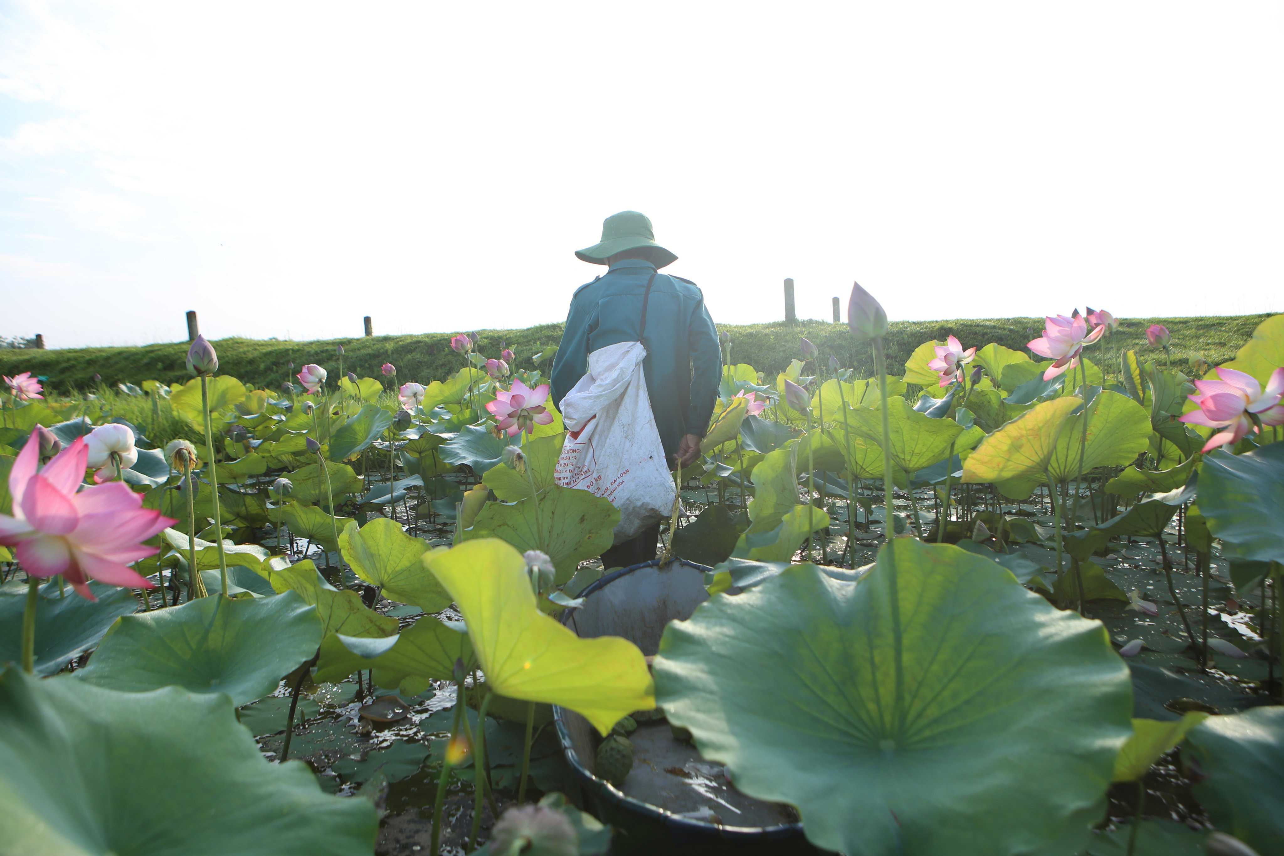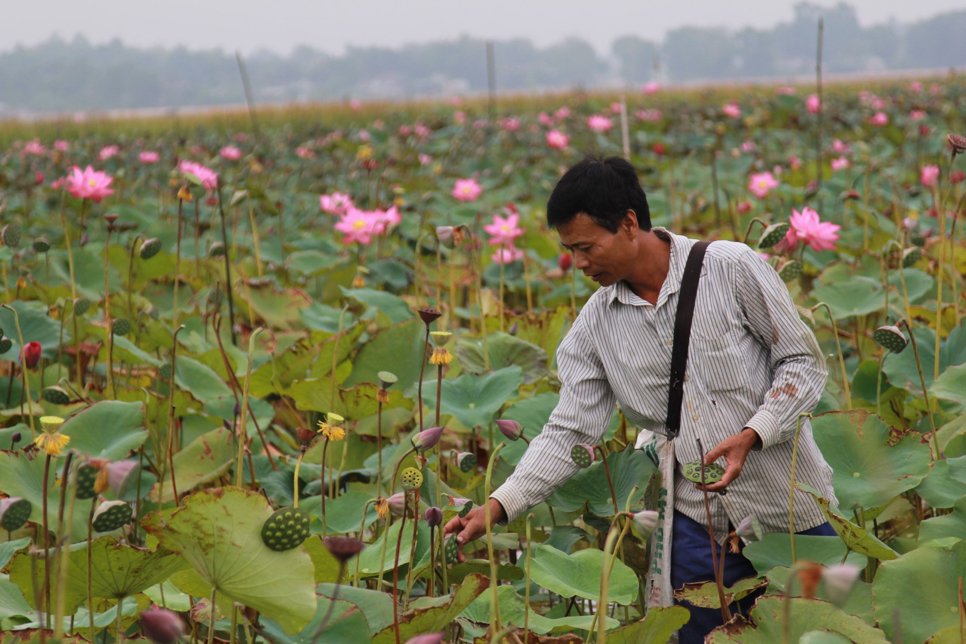 Cánh đồng rộng hơn 7 hecta trước đây trồng lúa rồi bị bỏ hoang, nay người dân chuyển sang trồng senTừ sáng sớm, người dân lội xuống bùn thu nhập đài sen. Công việc nặng nhọc nhưng mang lại cho họ nguồn thu từ 10-30 triệu đồng mỗi vụKhu vực này có khoảng 60 hộ dân trồng sen, trên diện tích hơn 7 hec ta. Người dân dùng cộc gỗ cột túi nilong để phân định ranh giới chủ sở hữuĐể tránh nắng nóng, nông dân thường đi vào sáng sớm hoặc chiều tối để thu hoạch đài senTừ tháng 2, sen bắt đầu nở, đến cuối tháng 7 tự tàn. Người dân tranh thủ thu hoạch đài sen từ tháng 5 đến tháng 8Công đoạn thu hoạch sen rất vất vả vì phải ngâm mình, lội hàng tiếng đồng hồ dưới bùnMỗi sào, người dân thu về bình quân 3-4 tạ đài sen tươi. Đầu mùa, họ bán với giá dao động từ 40.000-50.000 đồng/kg hạt tươi, còn hiện nay giá trung bình 35.000 đồng/kg. Ước tính mỗi hộ dân thu về 10-30 triệu đồng mỗi vụ sen.Trong khoảng 3 ngày, người dân sẽ hái đài sen một lần. Mỗi người có thể hái được từ 20-50 kg/buổiNhững bông hoa khoe sắc, thơm ngát trên cánh đồng trước đây từng bỏ hoang vì mất mùaNăm nay sen được mùa, đài sen lớn, hạt to, ăn có vị ngọt bùiNgười dân mang túi xách một bên để tiện di chuyển hái đài sen giữa cánh đồng bùn lầy. Nhờ chuyển đổi trồng sen nên bà con có thu nhập cao.Sau khi thu hoạch đài sen, nông dân đưa về bán lại cho thương lái. Những đài sen già, có màu đen sẽ bán được giá cao hơn những đài sen non.