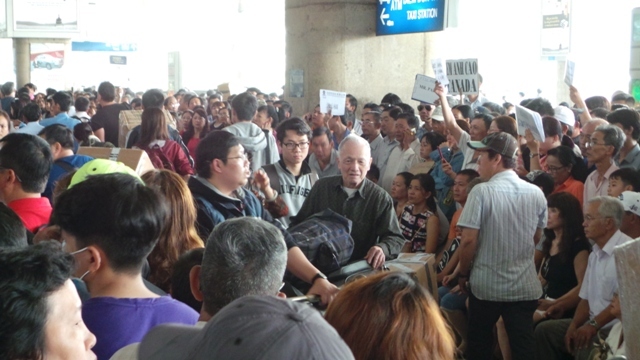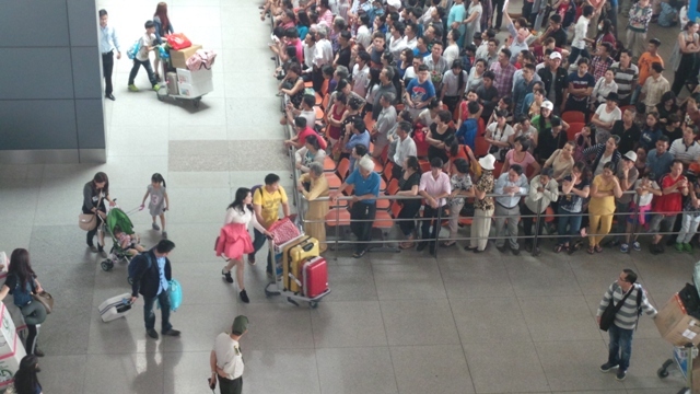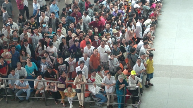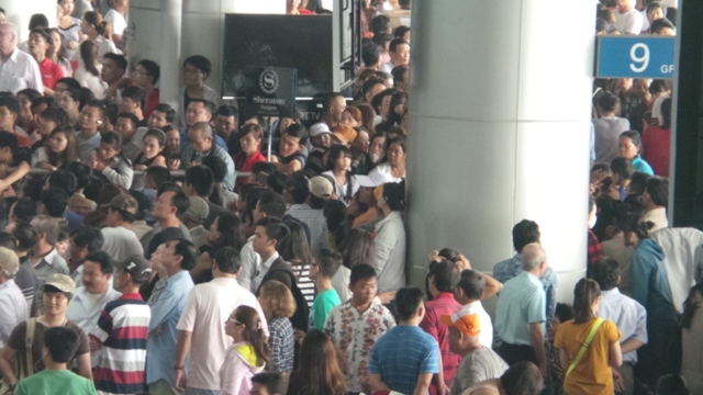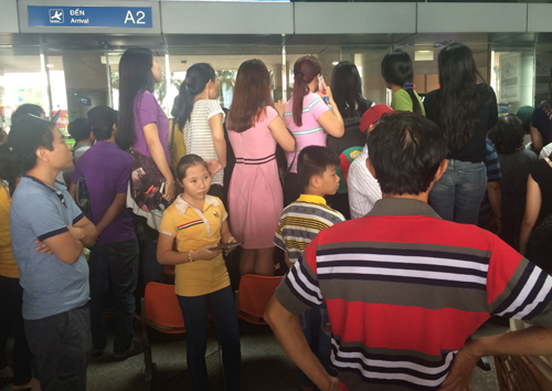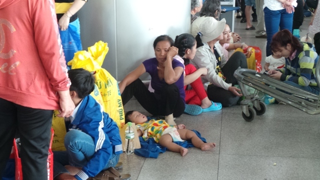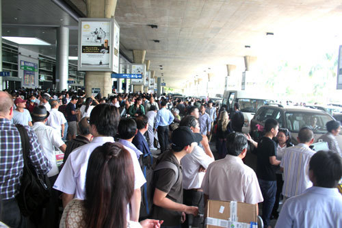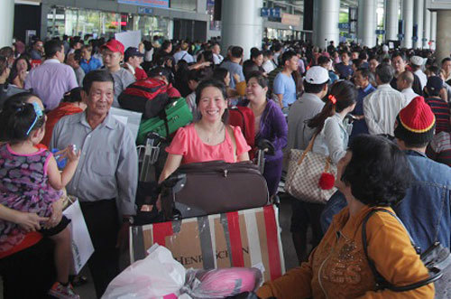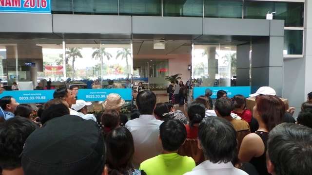 Trưa 1/2, hàng loạt chuyến bay quốc tế từ Mỹ, Pháp, Nga, Đài Loan, Úc, Hàn Quốc…đáp xuống sân bay Tân Sơn Nhất với tần suất cao hơn bình thường. Cùng với đó, bên ngoài sảnh chờ là hàng nghìn người đi đón thân nhân. Đỉnh điểm là thời gian từ 10 đến 12h, hàng ngàn hành khách Việt kiều về quê ăn Tết cộng với nhiều đoàn khách du lịch nước ngoài đến Việt Nam khiến khu vực cửa ra đông nghẹt người. Phía trước khu vực sảnh chờ, ngay cửa ra quốc tế, hàng ngàn người gồm nhiều thành viên trong gia đình kéo đến sân bay chờ đón người thân Do lượng người quá đông, các dãy ghế chờ quá tải, không còn chỗ trống, nhiều người buộc phải đứng hàng giờ đồng hồ ngóng người thân. Việc chen lấn trong “biển người” chầu chực thân nhân về quê ăn Tết làm nhiều người bơ phờ, mệt mỏi. Các cụ già và trẻ em nằm ngủ luôn tại đây... Hỗn loạn nhất là khu vực lối đi cho hành khách, dòng người chen lấn, đứng chờ lấn chiếm hết lối ra, khiến việc đi lại gặp rất nhiều khó khăn. Đội bảo vệ nhà ga phải làm việc liên tục tuýt còi nhắc nhở... Chú Hùng (quê Đồng Nai) bế đứa cháu nhỏ đang ngủ vì mệt cho biết: Do không có chỗ đứng và không thể chen lấn với dòng người nên đành ngồi bệt trên nền nhà ga, chờ đứa em trai từ Mỹ về quê ăn Tết.