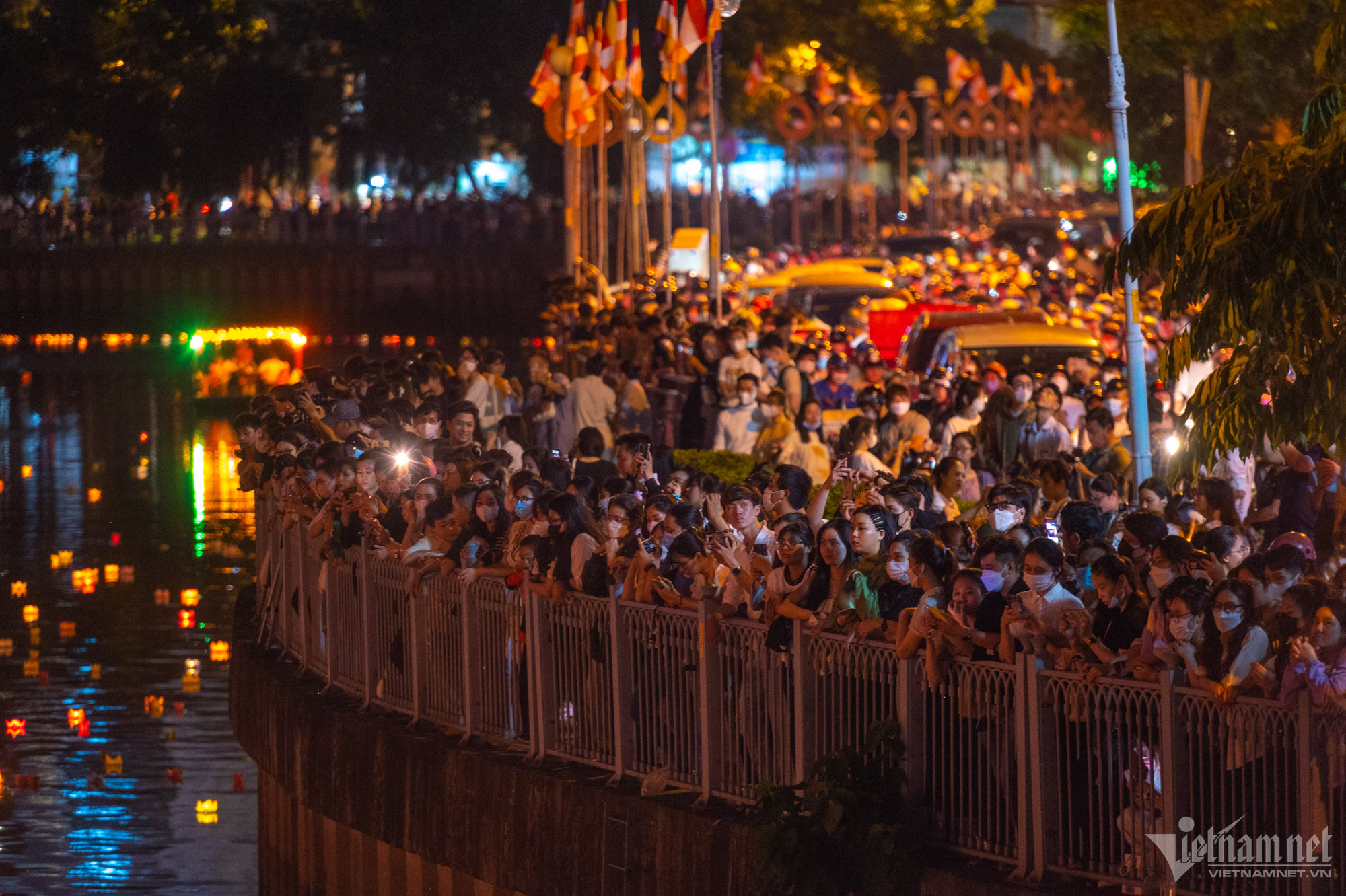Người dân đứng kín hai bề bờ kênh để chiêm ngưỡng những cánh hoa đăng lung linh mang theo những lời cầu phước.